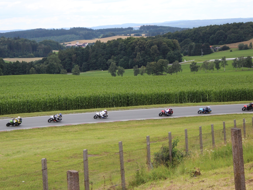 Wir kamen wieder auf die Start / Ziel Gerade und jeder fuhr an seinen Platz. Visier runter und alle standen, die Ampel auf Rot, Kupplung ziehen, Gang rein, Motor auf Drehzahl, volle Konzentration auf das Lichtsignal… AUS!!! Los geht’s, Gas auf Anschlag, die Gänge ohne kuppeln durchschalten, hier vorbei, da vorbei und im Getümmel auf die erste Kurve zu. Vor mir berühren sich zwei Fahrer, sie berühren sich laaange und dann zack. Der äußere zieht den Kürzeren und stürzt. Ab nach innen und vorbei. Weiter durch beschleunigen auf die blinde Kurve am Buchhübel zu. Beim Start konnte ich schon 10 Plätze gut machen und lag auf Platz 20 (Das wusste ich allerdings während dem Rennen nicht. Sämtliche Platzierungen während dem Rennen habe ich hinterher durch Betrachten der Bilder ermittelt.).
