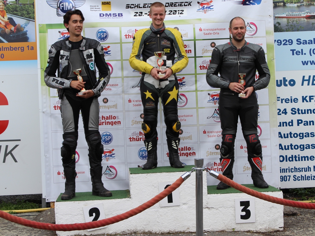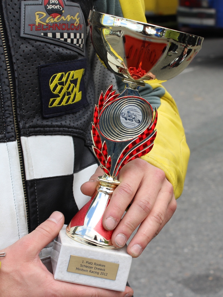 Anschließend kam die Minitwin Wertung. Dort landete ich auf Platz 9. Hier gab es bis zum 6. Platz einen Pokal. Mein neues Ziel liegt also auf der Hand. In der Minitwin Wertung einen 6. Platz einfahren um auch hier meinen ersten Pokal zu erfahren. Zum Schluss kam noch die Rookie Wertung, in der ich dann den 1. Platz vor Marlon (#506) und Christian (#514) belegte. Große Freude meinerseits, denn was in Schleiz mal richtig genial war, war dass es hier ein richtiges Treppchen gab und zu Ehren des Siegers die Nationalhymne gespielt wurde. Das imponierte mir bei den Siegerehrungen zuvor schon, doch jetzt stand ich oben und die deutsche Hymne wurde gespielt. Gut, es war "nur" die Rookie Wertung, aber das Gefühl war sensationell :-)