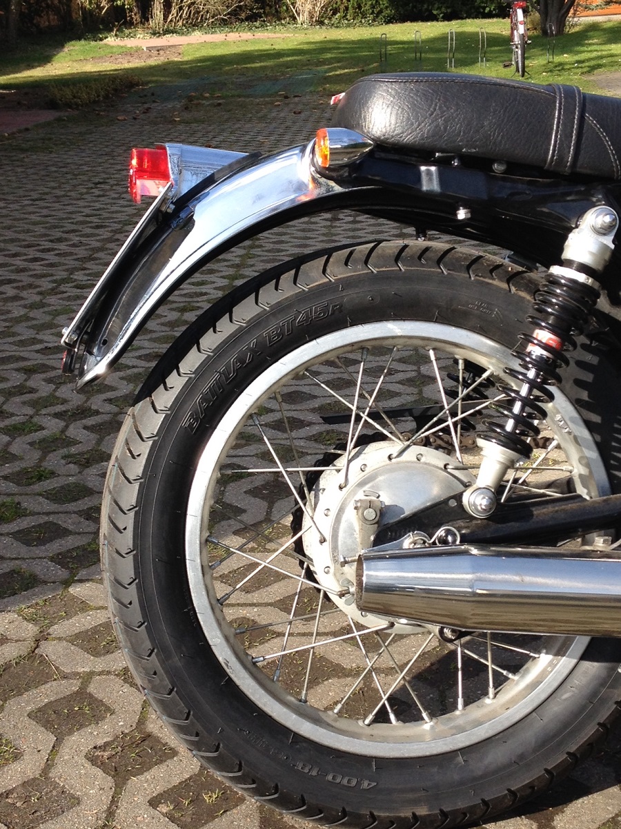 Mußte noch etwas vorsichtig tun, die neuen BT 45 wollen erst mal angefahren werden. Aber zum Einrollen genau der richtige Modus. Ein paar Änderungen gab es natürlich auch noch. Neues Öl plus Filter natürlich. Kotflügel vorn und hinten sind "neu", also in hervorragendem gebrauchten Zustand und ohne Macken im Chrom. Hinten gab es ein Lucas-Rücklicht, dadurch kam das Kennzeichen höher...ich finde, das paßt hervorragend in die Linie. Über den Winkel des Blechs kann man streiten, sollte aber noch durchgehen...bei Kontrollen hat die Kiste eh einen Sympathiebonus