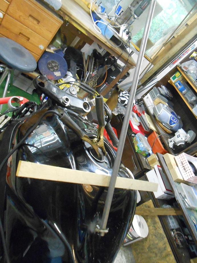 Zunächst war die hintere Tankhalterung zu richten das war nicht weiter schwierig. Die vorderen beiden Haltelaschen musste auch wieder in Position gebracht werden ,denn der Tank wurde bei dem Crash ordentlci nach vorne gedrückt.