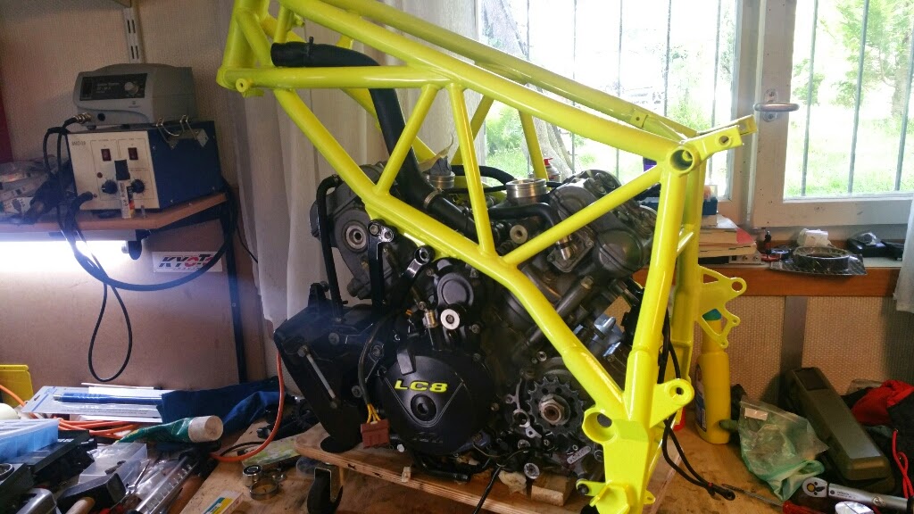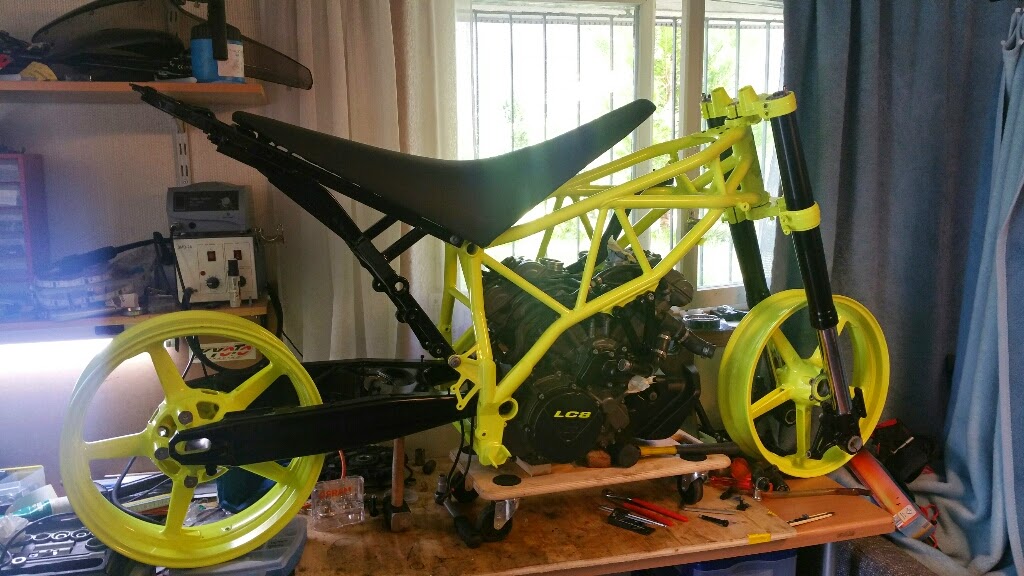 kette ist ori drann. bei gelegenheit schwarzes supersprox bestellen und gelbe kette. bremszangen müssen auch schwarz werden mit gelber brembo aufschrift. lenker muss neuer her oder der alte eloxiert werden. hab den nur lackiert. lampenmaske wollt ich eine andere haben, ausserdem soll das schutzblech vorne auch anderst. hinten dass selbe. die feder hat nicht den selben farbton. doofer lackierer. hab se trotzdem eingebaut, da ich morgen an die prüfung wollte. ja nu.. jetzt ist alles am asch