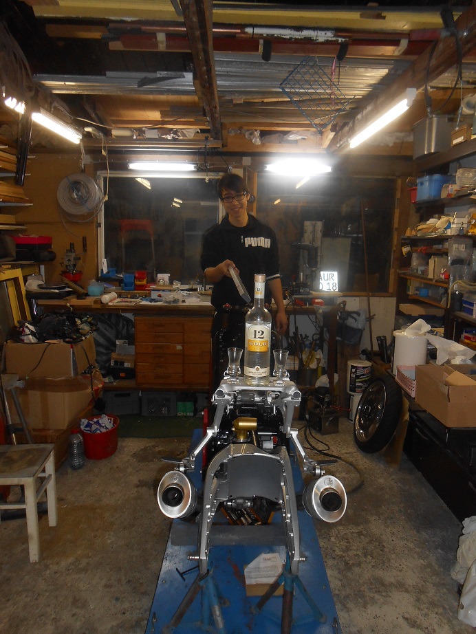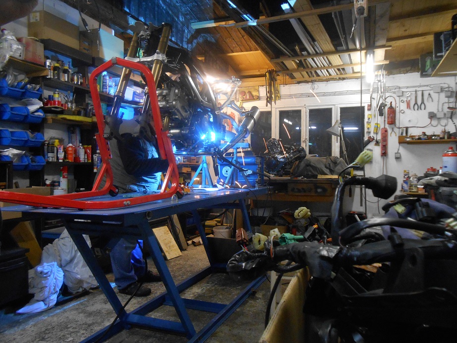 Wir habe also die Auspuffanklage montiert, und möglichst genau ausgerichtet. Das ist gar nicht so einfach, das so hinzubekommen, das die beiden ESD's "synchron" sind. Ich denke aber, das wir das so gut es eben ging hinbekommen haben. Dabei ist uns aufgefallen, dass die linke Soziusraste etwas weiter absteht. Dann haben wir noch eine Halterung für den Krümmer auf der rechten Seite zum Rahmen gebaut und abgeheftet.