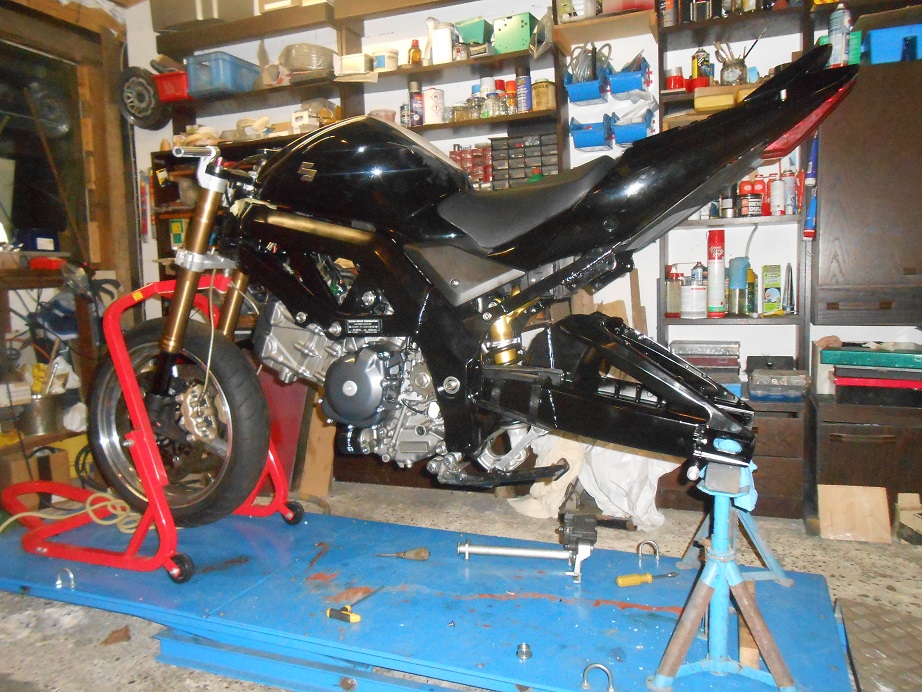 Ein Problem gibt es noch mit dem Tank. der ist durch den Crash so weit nach vorne gestaucht, das die Halterungen nicht so recht passen -- obwohl wir da schon eine Menge dran gebogen und gezerrt haben -- 8O :? :cry: