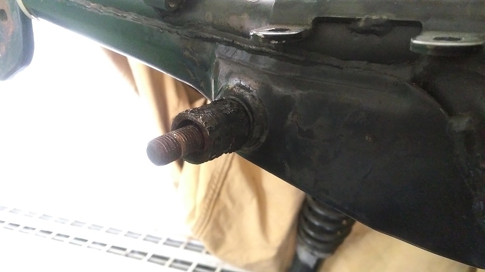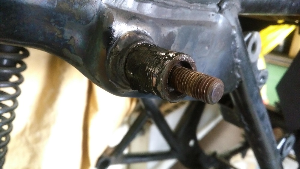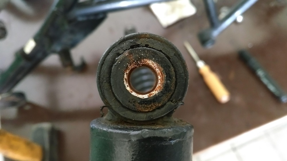 So und nun geht es in die Gegenwart. Ich komme, weil ich auf Teile bzw. die „frischen“ Felgen von SuziQ warte, nun doch wieder dazu ein wenig an der Kawa weiter zu schaffen. Ich habe mich nun dafür entschieden die Federbeine aufzuarbeiten. Im Prinzip eine ähnliche Prozedur wie bei der Gabel. Sollte also klappen wenn es den nicht bei der Demontage der kleinen Beinchen ein Problem mit den oberen Lagern gegeben hätte. Die Stahlhülse waren derart festgebacken das sie jeden Versuch wiedersetzt haben sich von Rahmen lösen zu lassen. Letztendlich habe ich Sie nur mit Gewalteinwirkung eines Lagerabziehers demontieren können. Das ist eine schöne Umschreibung….. ich habe die Federbeine abgezogen aber die Gummis und die Stahlhülsen bleiben am Rahmen. Aber auch jetzt werten sich die Hülsen derart das ich diese nur noch mit der Flex und einer Millimeterscheibe lösen konnte.