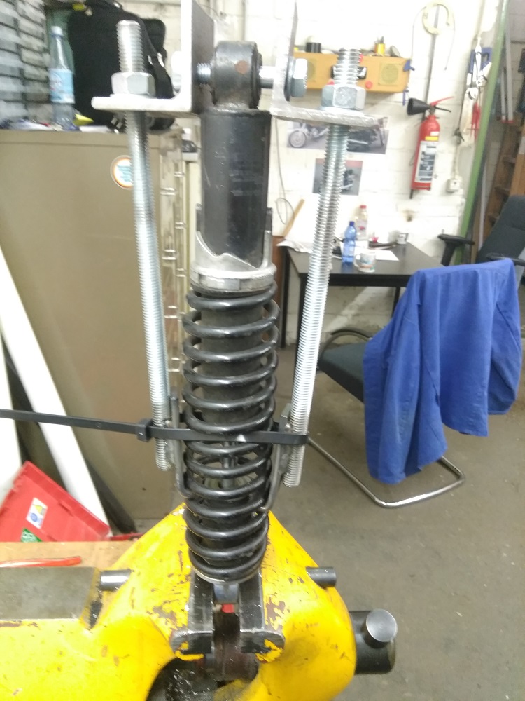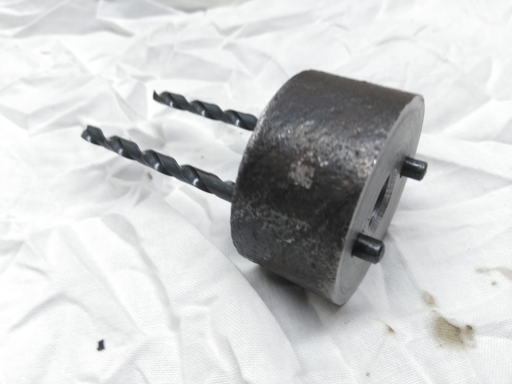 Aber jetzt zum Tagesgeschäft…….. gut das ich mir mal Einfache Federspanner gebastelt habe und sogar noch wusste wo ich diese „verlegt“ habe. So war es eine schnelle Geschichte die Feder und Dämpfer voneinander zu trennen. Jetzt konnte man erkennen wie oder besser mit welchen Werkzeug man den Dämpfer öffnen kann. Was natürlich klar was ist das ich keinen verstellbaren Zapfenschlüssel oder gar Nuss hatte. Aber zum Glück ständigen Zugang zu passenden Werkzeugpark. Also fertigte ich mir ein passendes selbst und mangels gehärteter Zapfen missbrauchte ich passende Bohrer für mein Werkzeug. Ist dieser Zweit durfte die Mutter schon mal ein Bad in Kriech Öl genießen. Jetzt war alles zusammen um dem Dämpfer zu öffnen. Der erste Versuch hat nur Kraft gekostet…….. für den zweiten habe ich den Gewindebereich dann mit dem Heißluftföhn erwärmt und das gleiche Ergebnis wie im ersten Versuch. Die Mutter weigerte sich strickt ihre Funktion aufzunehmen.