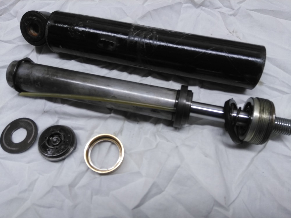 Jetzt hatte ich die Faxen dicken und die gute alte Lötlampe kam zu Einsatz. Gut erwärmt im Gewindebereich und schon wieder……………….. Nein die Mutter nahm endlich ihre Arbeit auf und dreht sich. Jetzt zum Ende des Tageswerkes den Dämpfer entleert und grob gereinigt. Innenleben des Dämpfers sieht für sein Alter sehr gut aus. Das wird nicht lange aufhalten. Das Dämpferrohr habe ich schon mal grob entlackt damit die Bezeichnungen und Nummer besser zu lesen sind. Und neu lackiert werden sie Eh. Jetzt erst mal bei „ Ikon „ anfragen was mir die Dichtungen kosten und ob die Gummis der Augen noch zu bekommen sind. Wenn nicht >>> Drehbank.