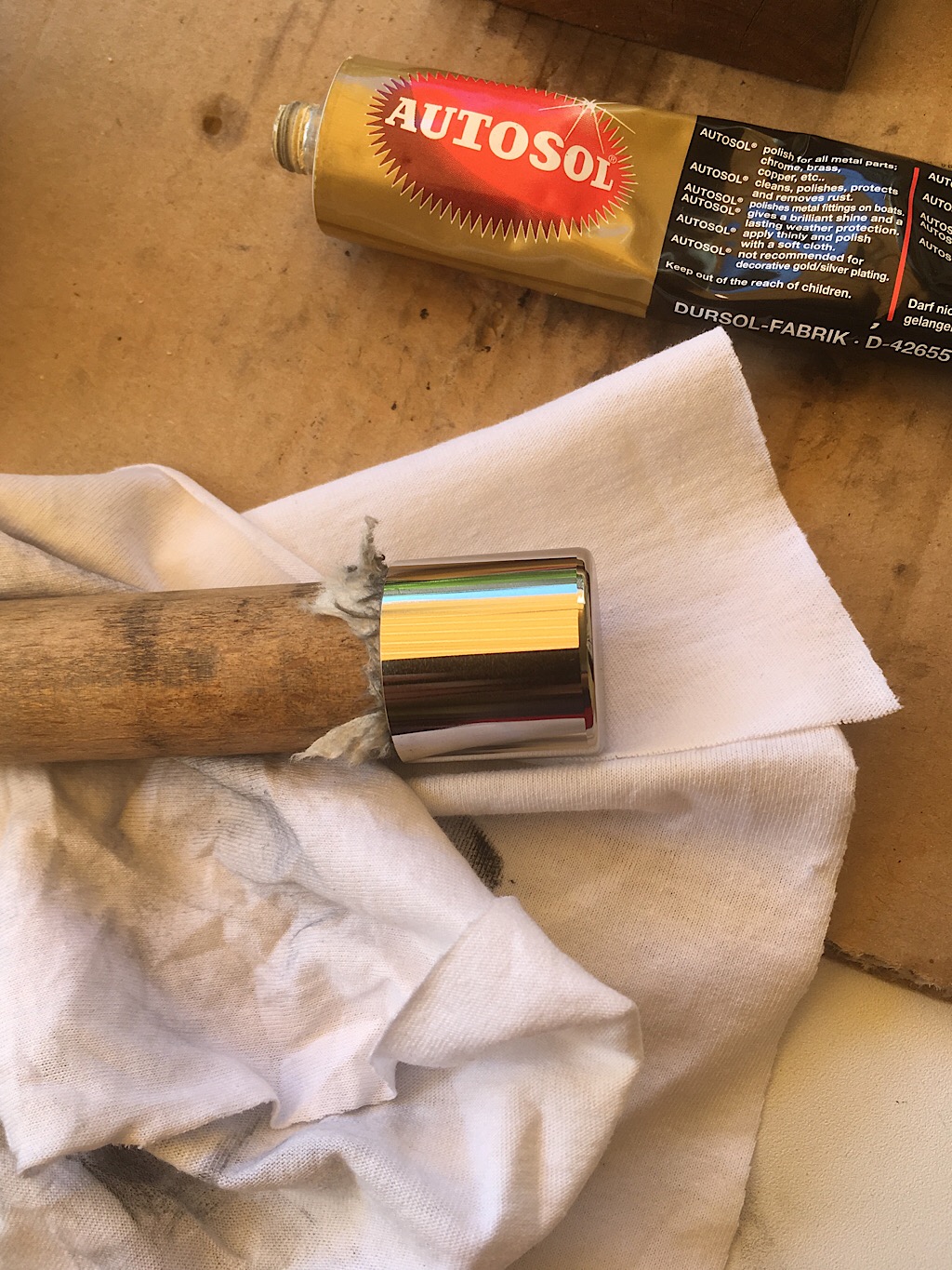 Hilfsmittel: Tücher, Wischweg, Wattestäbchen, Autosol, Rundholz, verlängerte Nylonbürste, Schraubendreher und abgeschnippelter Dübel