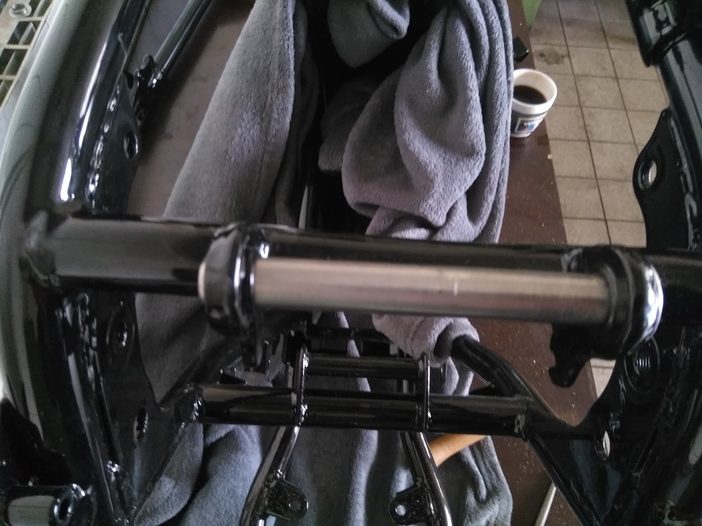 So Heute war ja Top Wetter…… Nix SV ausführen und die Ketten Kit´s bekomm ich erst Freitag. Also gerade ran an den Triple. Kurz Schwinge ist drin > Neu auf Mitte Distanziert die Endkappen leicht gefräst / Dummy für Federbein gebastelt. Dann Sitze von LKL von Restpulver befreit und Lagerschalen eingepresst. LKL und Gabelbrücken mit sehr viel Fett montiert und Gabelhole verbaut.