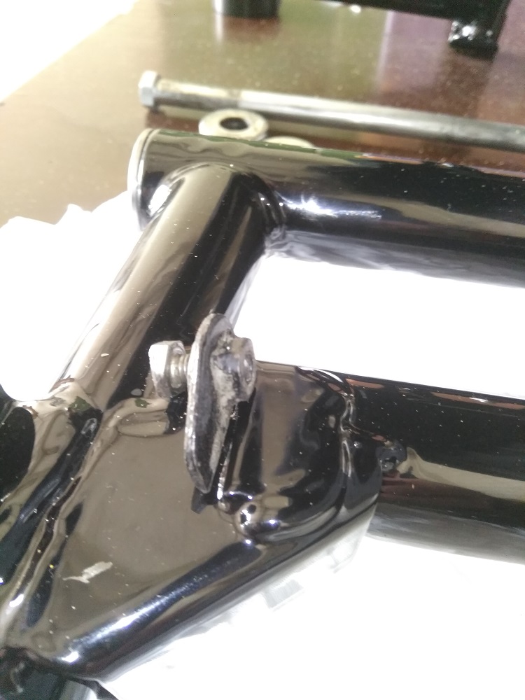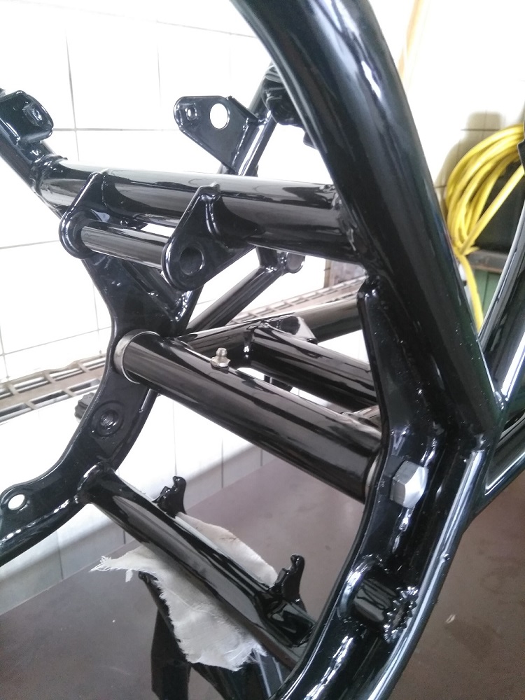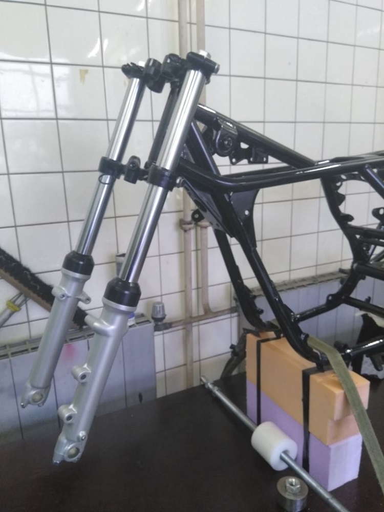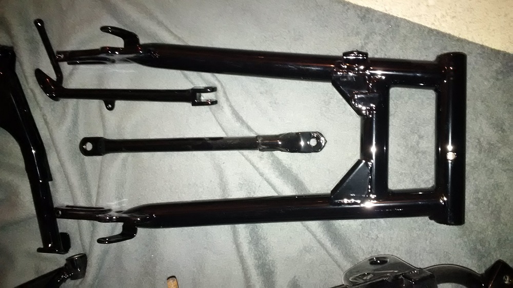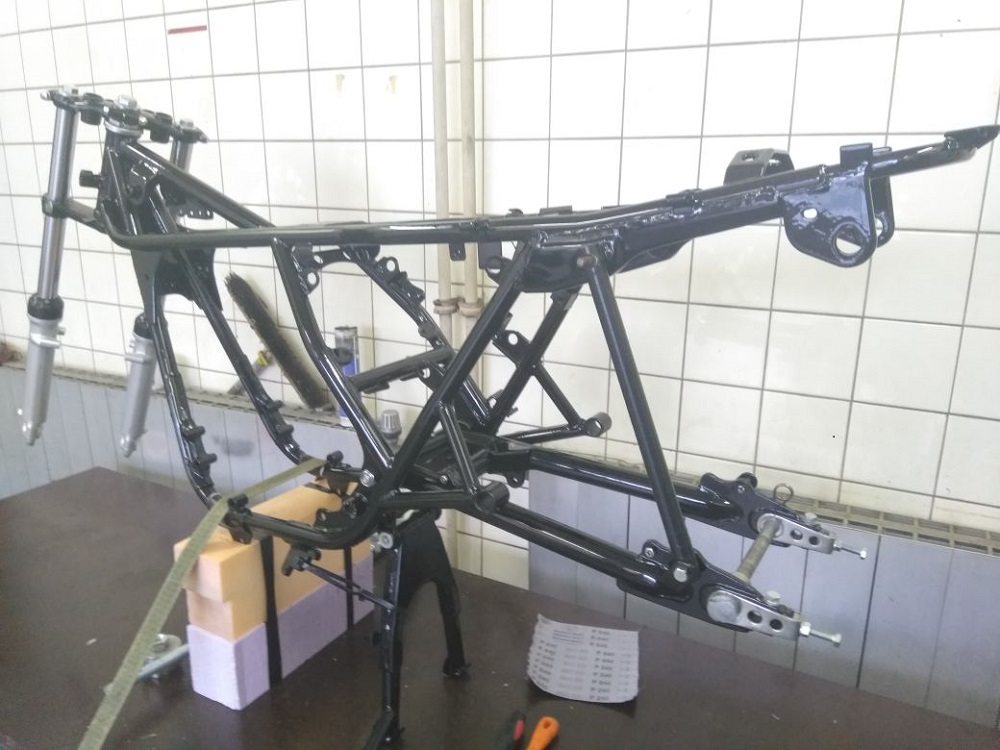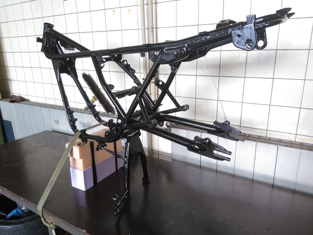 So es geht langsam weiter mit dem Triple. Der Rahmen ist jetzt „Aufgespannt“ und Probehalber war die Schwinge schon mal an ihren Platz. Sie musste aber noch mal ein wenig Bearbeitet werden. Die Gewinde und Achsaufnahme mussten noch von Pulver befreit werden und die Kettenspanner gereinigt und leicht überarbeitet werden. Jetzt liebt das gute Stück bereit um endgültig wieder seinen Platz einnehmen zu können. Das wird noch etwas heikel da es auch hier auch Eng zugeht. Die Pulverbeschichtung baut nun mal ein wenig mehr auf als Lack.