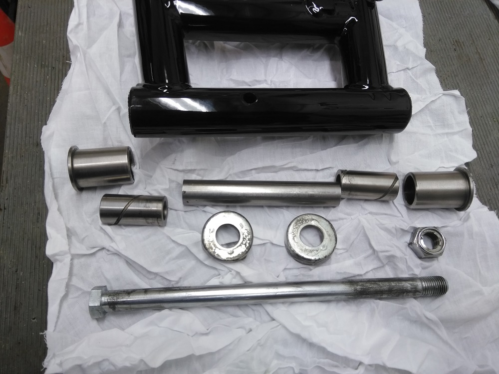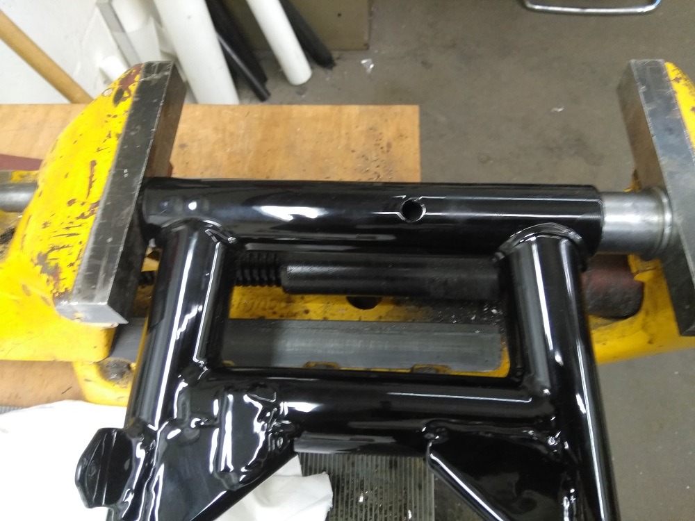 Dann ging es mit der Vorbereitung der Schwinge weiter. Erst mal die Lagerseite. Auch hier wieder an der Lagerung Pulver entfernen und schon konnte die erste Buchse eingepresst werden. Diese aber mit dem Schraubstock. Der geht weit genug auf und so waren die Buchse nach 3 Minuten an Ihren Platz. Und Eierfarbe für Heute.