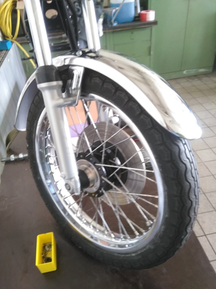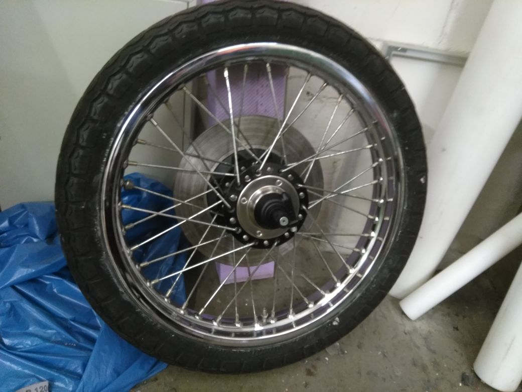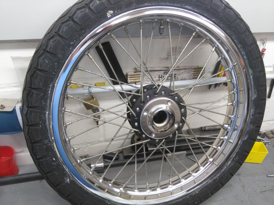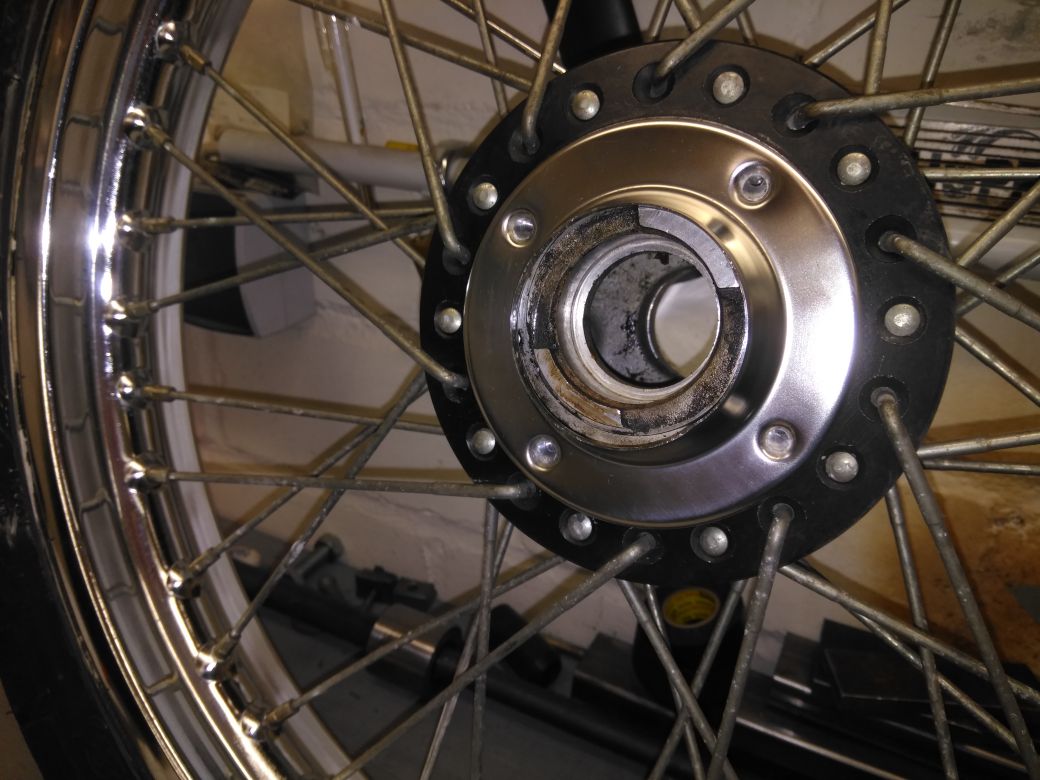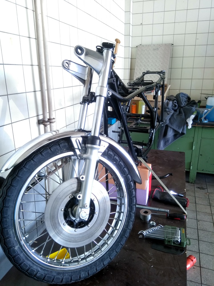 Die Triple ist zurzeit etwas vernachlässig worden von mir. Aber die anderen haben im Frühjahr Vorrang. Ein wenig ist trotzdem passiert. Die Reifen haben wieder „Druck“ bekommen. Ich war schon überrascht dass nach all den Jahren die Schläuche 1,2bar aushielten. Vereinfacht das ganze Projekt aber schon da ich jetzt noch keine neue Bereifung brauche. Die neuen Schlappen werden jetzt das letzte was unmittelbar vor der TÜV gekauft wird. Zurzeit beschäftige ich mich mit dem Vorderrad. Kranz hat schon ein Autosol Behandlung und ist glänzend geworden. Die Speichen sind gerade in Arbeit. Diese werden aber leicht Fleckig womit ich aber gut leben kann. Tachoantrieb und Kleinteile sind schon überarbeitet und Einbaubereit. Nach den Speichen noch den Bremsscheibenträger wieder neu schwärzen und dann mit neuen Lager alles wieder zusammenbauen.