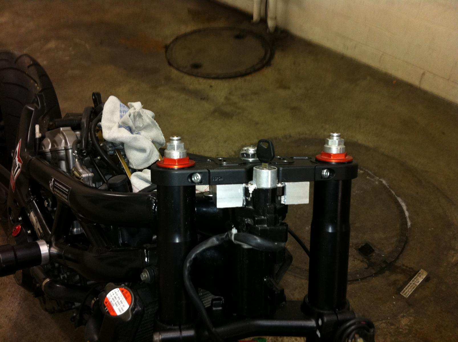 Schöne Sache. Kannst du noch mal ein Detailfoto machen? Ich hab noch nicht kapiert, wie das Schloss durch das Aluteil bis zum Lenkkopf kommen soll (also der Schließbolzen)