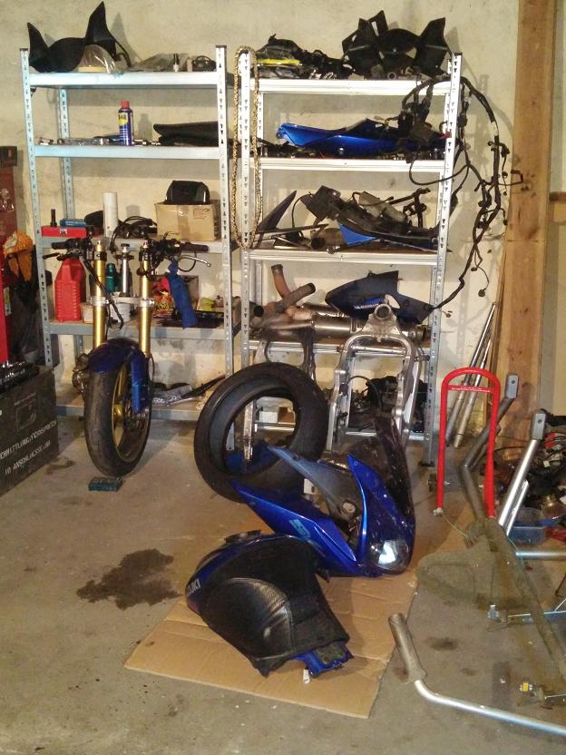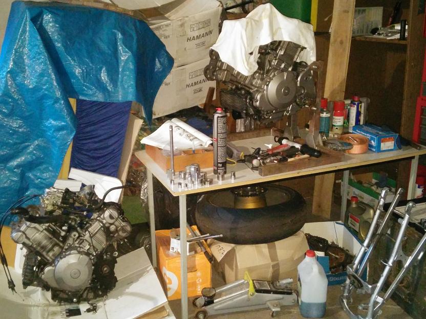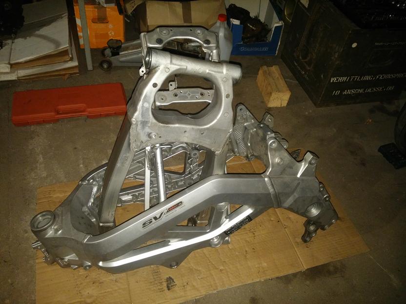 Die Kiste ist jetzt soweit komplett zerlegt bis auf Gabel, Schwinge und Motor.