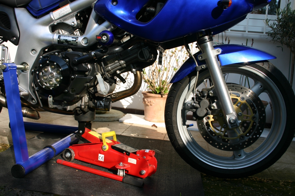 Es macht absolut keine Probleme mit dem Wernerständer und einem Wagenheber unterm Motor die SV vorne anzuheben um Rad und Gabel zu demontieren.