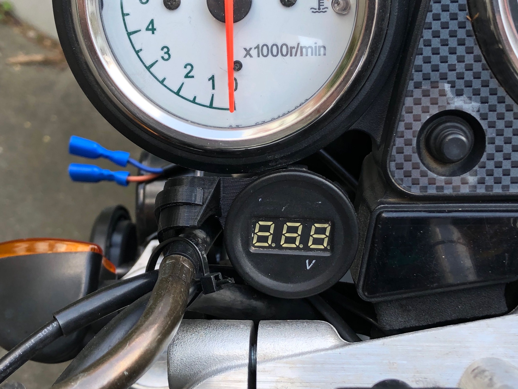 Seit einiger Zeit bin ich auch mit einem Voltmeter unterwegs, das ich Jubelrömer abgekauft habe. Bis heute was es mittels eines stümperhaft zurechtgesägtem und -gebogenen Alublech montiert, ich habe mich dann aber ein bisschen an Fusion360 gesetzt und eine vernünftige Lösung entworfen, die gerade noch im Druck ist.