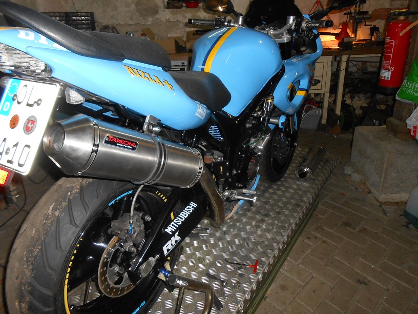 Ich habe die SV mal laufen lassen, naja, der Sound (mir Eater) ist schon nicht schlecht, aber viel zu laut -- so werde ich nicht fahren, da muss ich mir noch was einfallen lassen. Sonst gefällt mir das nicht schlecht. Ich werde den ESD aber noch Schwarz machen. So wie das jetzt gebaut ist, kann ich auch problemlos den Shark montieren/fahren.