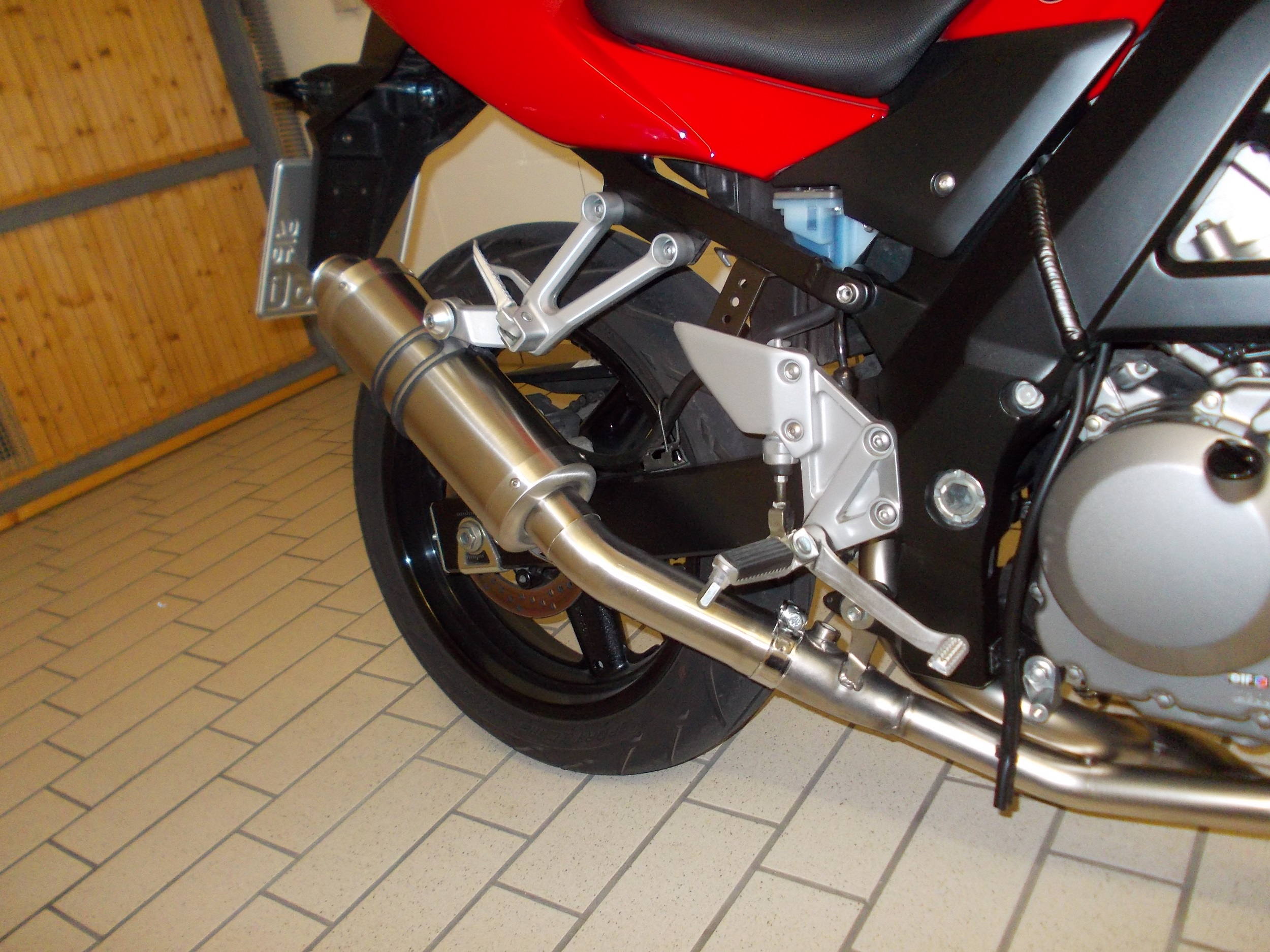 Beim Inspizieren des Motorrads fiel mir dann gleich auf, das sich etwas gigantisch großes, silbrig glänzendes Teil am Heck der Maschine verfangen hatte… ach ne… des ist ja nur der Originalauspuff! :mrgreen:
