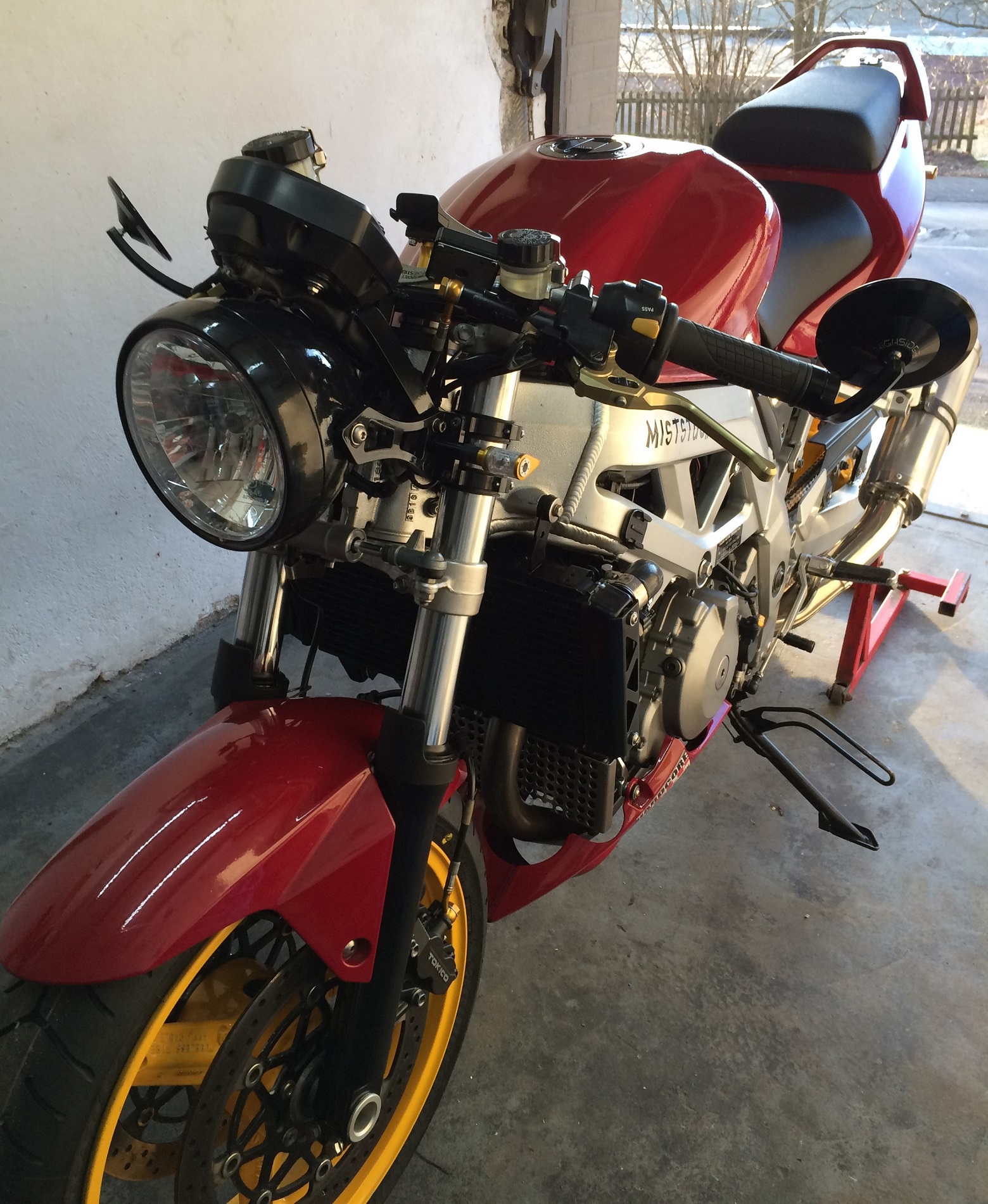 Dann will ich nun doch mal mein Miststück hier rein stellen.Sie ist fast fertig.Kommt nur noch ein neuer größerer Scheinwerfer druff.Den hab ich schon und haben ihn heute lackiert.Die SV ist eine 1000S K3 und hat derzeit 114.000 km runter mit erstem Motor und erster Kupplung.Mußte nur mal die Lima tauschen.