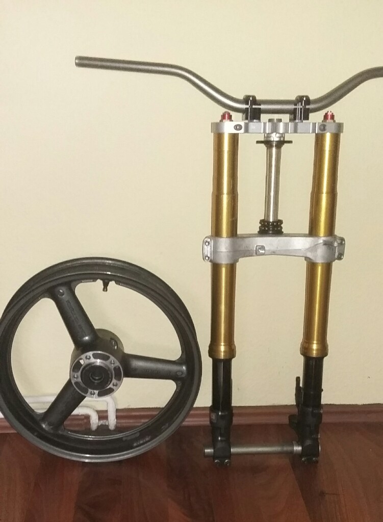 Es handelt sich hierbei um ne GSXR 1000 K3/K4 Gabel, mit einer unteren K6 Gabelbrücke mit passender LSL SBK Gabelbrücke garniert an passenden Lenkerklemmböcken für den Konifizierten Lenker.