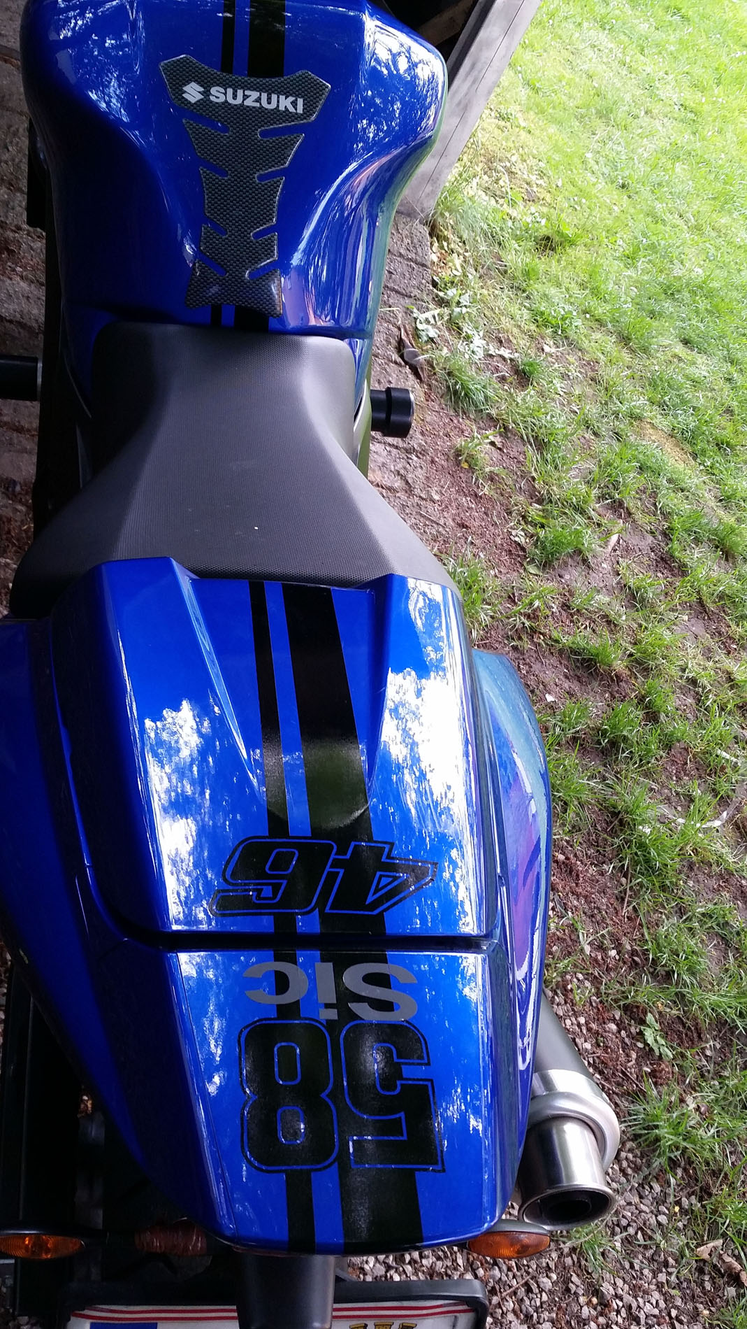 wieder zuhause angekommen wurde die suzuki wieder in ordnung gebracht. neuer lenker, neues bremspedal, neuer bremshebel, ein neues( gebrauchtes heck aus dem forum in passender farbe) und ein neuer auspuff.