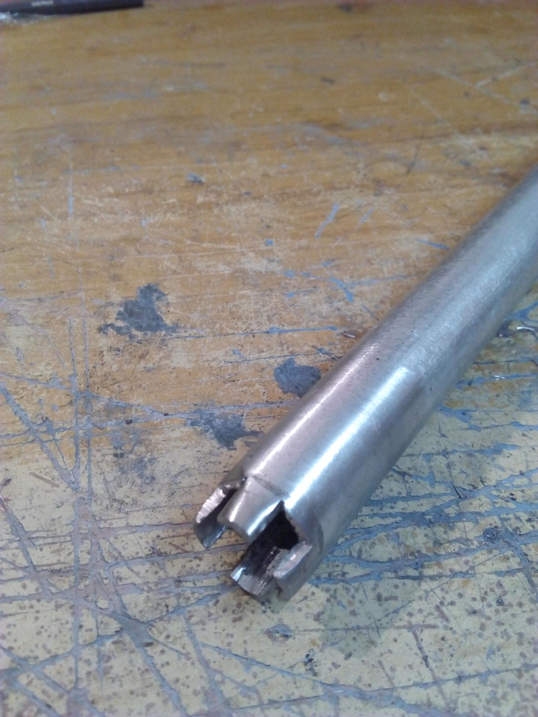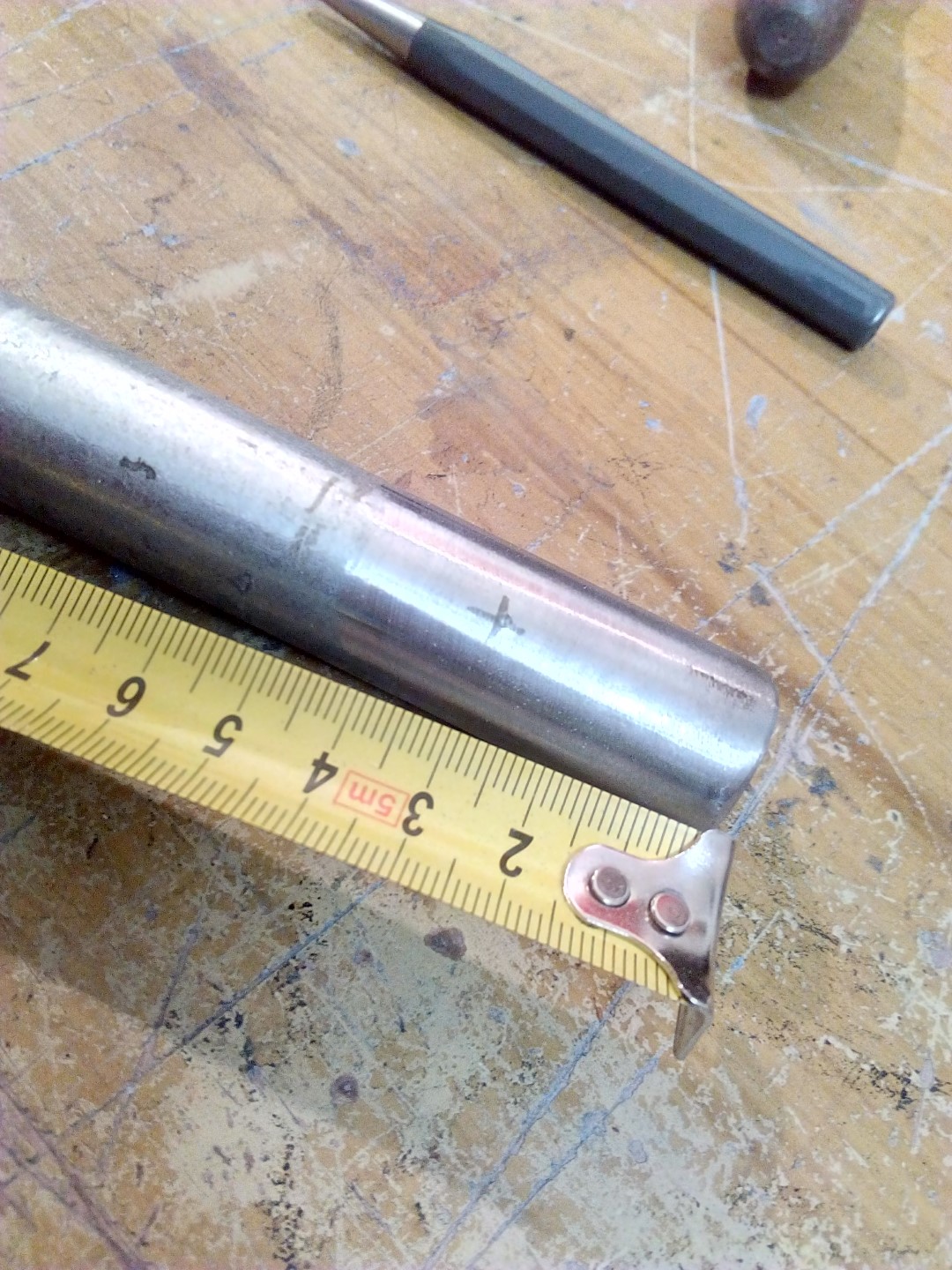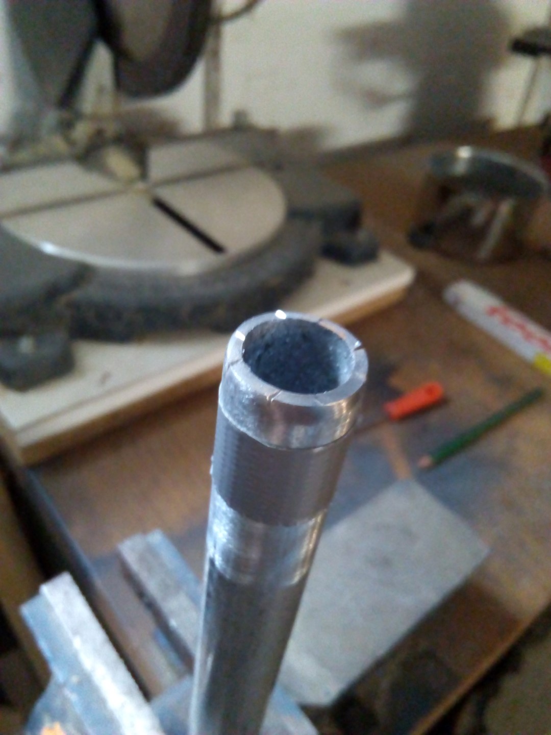 Als erstes hab ich die Gewinde vom Rohr abgesägt und die Enden ein wenig am Tellerschleifer "geschönt" (muss man aber nicht). Mit den abgeschnittenen Stücken kommt das Rohr dann auch ziemlich nah an die 42 cm Länge (glaube ich iwo gelesen zu haben..!?) vom OEM Teil ran.