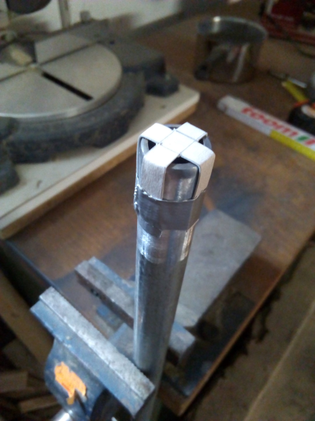Nun hab ich aus Pappe nen Kreuz mit 8 mm breiten Streifen ausgeschnitten und, nach Augenmaß zentriert, auf das andere Ende des Rohrs geklebt. Dies soll als Schablone für die Zacken dienen, die danach ausgesägt werden.