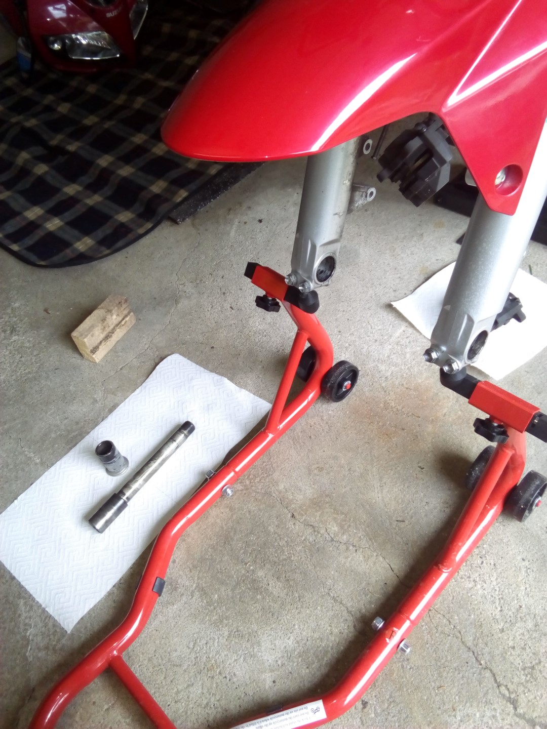 Als nächstes den Bugspoiler runter, damit ich unterm Motor noch den Scherenheber packen kann. Dieser dient zum einen zum zusätzlichen Stabilisieren, zum anderen kann ich später die Gabelholme rausnehmen ohne das mir der Bock nach vorne wegfällt. Logischerweise muss zum normalen Radausbau dieser aber nicht verwendet werden. Ich benutze die beiden Aufnahmen die eigentlich für Rohrahmen gedacht sind die unterm Motor verlaufen, um nicht mit dem Krümmerrohr ins Gehege zu kommen. Beide sind gummiert. Die Seite beim Krümmer liegt so auf, unter die andere kommt bei mir noch nen Holzkeil um den kleinen Höhenunterschied auszugleichen. Beide Ständer und den Heber habe ich übrigens von Ricambi-Weiss. Ständer-Set ~40€, Scherenheber ~41€. Funzen super! Allerdings werde ich mir für hinten noch die Aufnahmehülsen für an die Schwinge plus passende Adapter für den Heber besorgen. Gibt etwas mehr Arbeitshöhe...