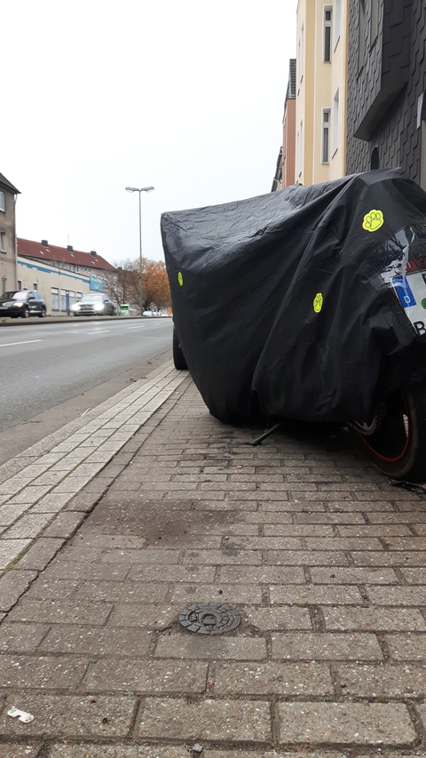 Und deshalb braucht man wenn man das Moped auf dem Bürgersteig abdeckt auch eine Plane mit Sichtfenster (wie das hier ja der Fall ist).