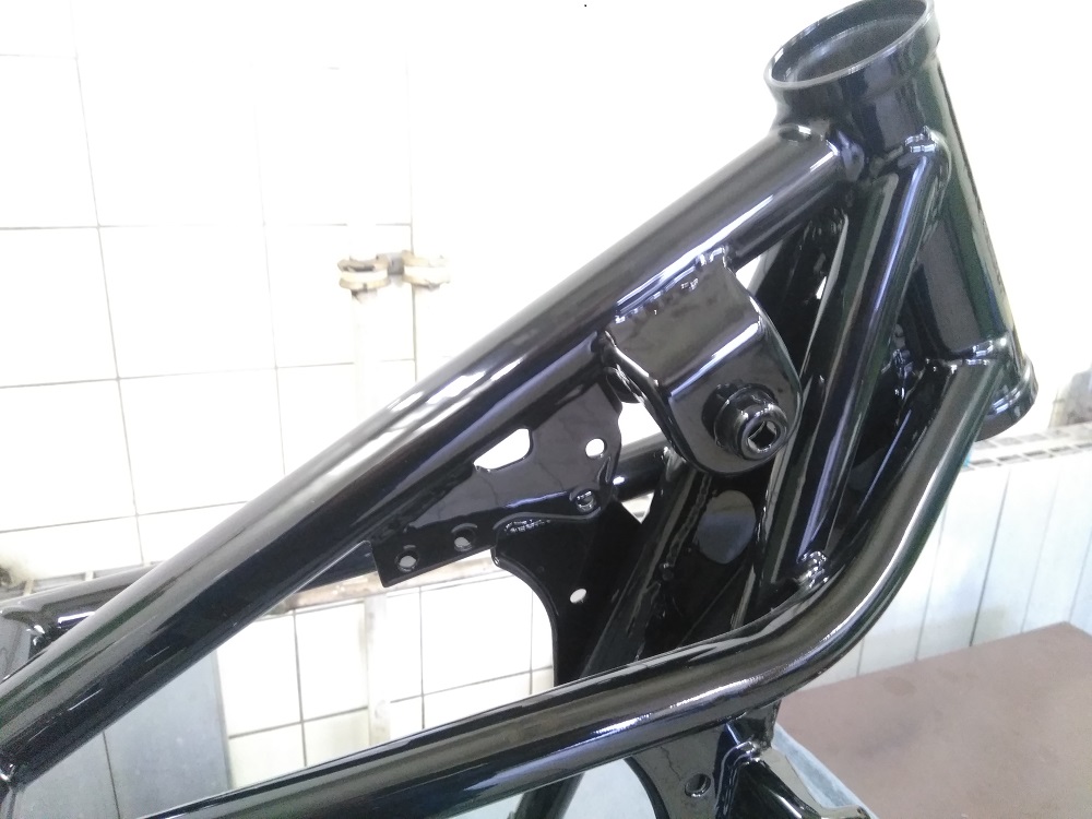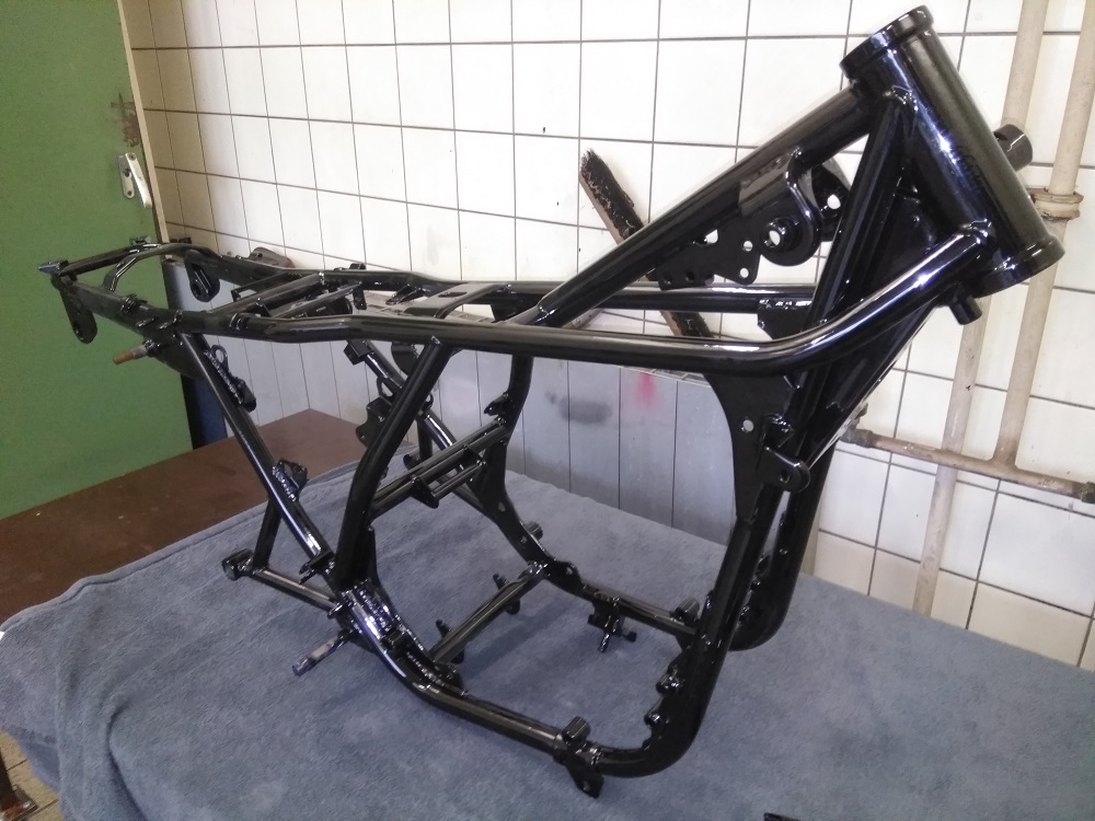 war ein langer Prozess bis zu dem Zeitpunkt „Point Of No Return“ aber ab jetzt Hoffe ich dass es nur noch vorrangeht. Jetzt wo der Rahmen / Schwinge und Ständer im frisch Glänzend auf der Bühne stehen entwickelt sich langsam wieder ein Gesamtbild im meinen Kopf. Es ist zwar noch ein langer Weg bis der Triple wieder „raucht“ aber es wird. Hier mal Bilder von heute . War gar nicht einfach einen Pulverbeschichter hier im Ruhrpott zu finden der gute Arbeit zu Angemessenen Preisen liefern kann. Habe mit einigen Telefoniert und die meisten hatten die Hütte voll (glaube aber eher das Sie keinen Bock auf Kleinzeug hatten) oder wollten mal richtig was auf die Tasche. Versand kam auf Grund der Abmessungen nicht in Frage. Das wird dann Richtig Teuer.