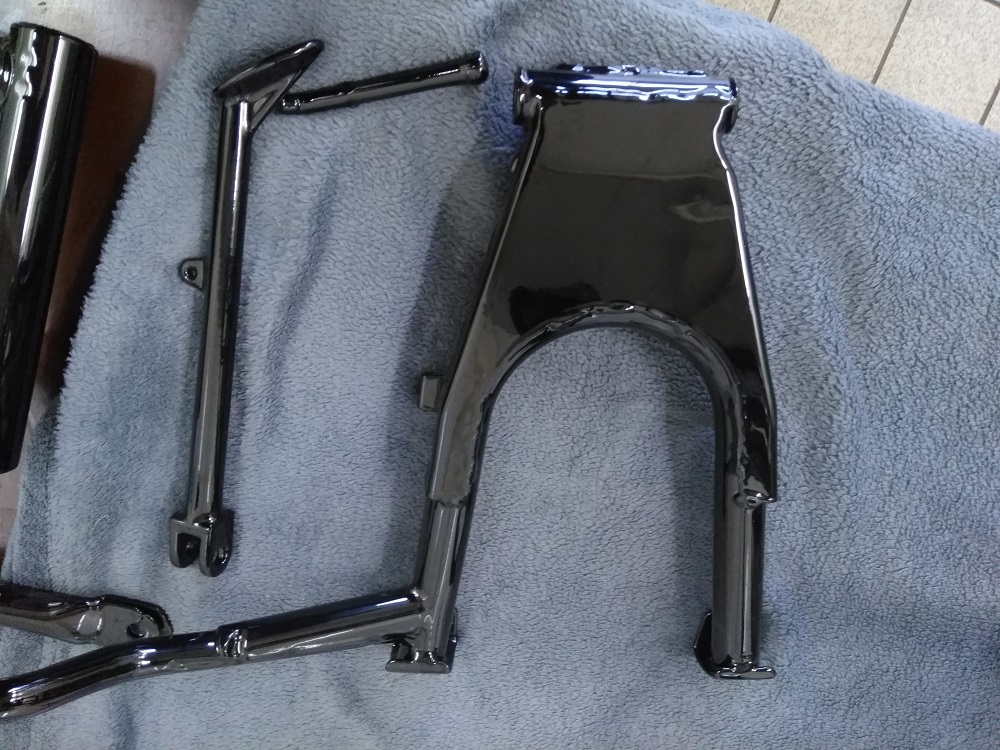 Ich bin ein Freund von Pulverbeschichtungen, richtig angewendet ist es schon eine tolle Sache. Widerstandsfähig und sehr Pflegeleicht. Der Rahmen der Bandit habe ich, sollte 2005 gewesen sein, auch Pulvern lassen. Wenn der mal Pflege braucht gehe ich nur mit einem feuchten Lappen drüber und Ruhe ist. Aber auch wichtig das man einen guten Beschichter hat. Damals habe ich es in Lübeck machen lassen. Ja die Versandkosten waren nicht ohne. Aber mein neuer vor der Haustür hat es wirklich drauf. Der Rahmen der Bandit und auch die Felgen der Diva sind leicht wellig. Dieses Bild habe ich bisher immer bei gepulverten Teilen gesehen. Mal mehr Mal weniger. Das ist jetzt bei den Triple Teile kein Thema. Sieht man gerade beim Hauptständer sehr gut.