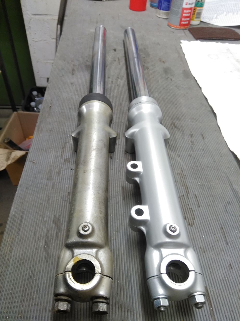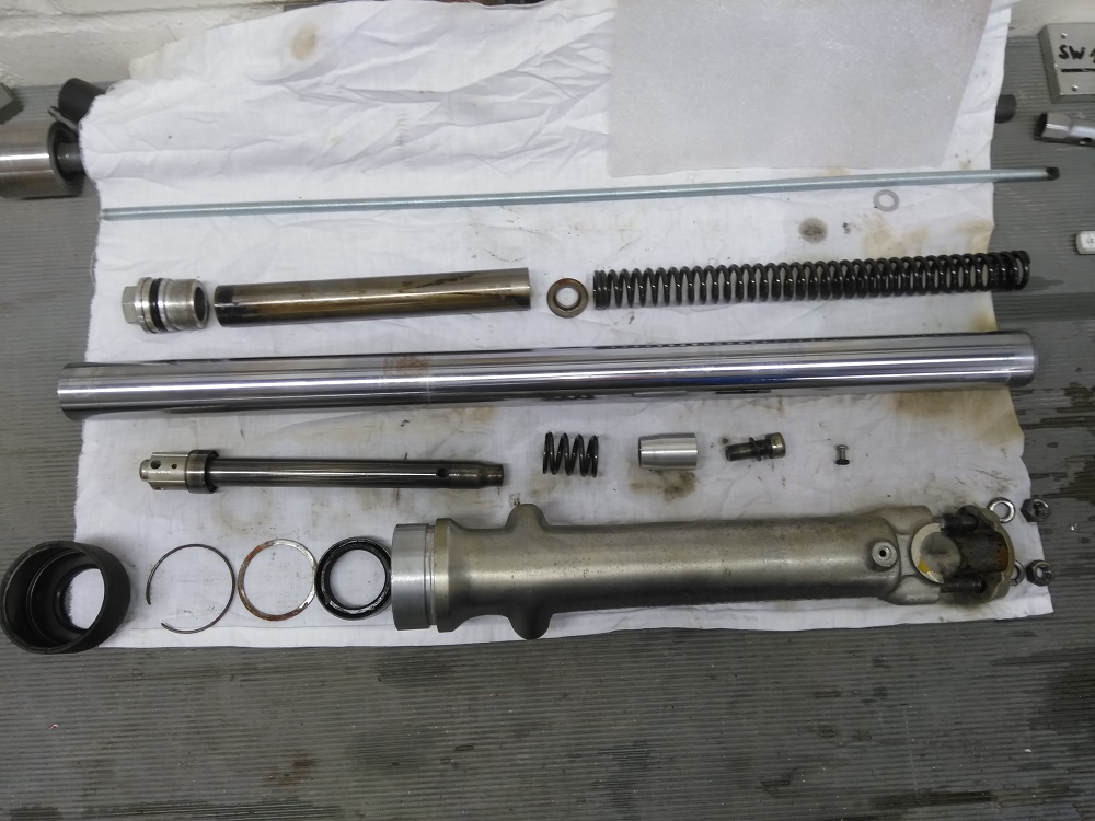 Na das wird wohl noch ein klein wenig Dauern bis der Triple wieder knattert. Das schöne ist ja das ich mir Zeit lassen kann. Zur Zeit bin ich an der Gabel dran. Diese ist in einen technisch wirklich guten Zustand. Ich habe keinen Verschleiß feststellen können. Gut so hier ist es mit Reinigen > Schleifen :( > Lackieren > Abdichten und Befüllen getan.