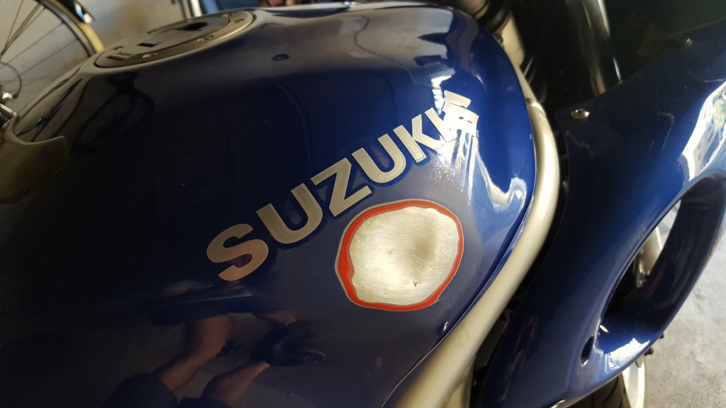 Die Delle ist jetzt ja nicht soo groß, da hält auch Spachtelmasse gut drauf. War bei meiner Bandit nach dem Unfall auch so, mindestens genau so groß. Du musst sie nur richtig trocken bekommen, damit sie nicht iwann einfällt.