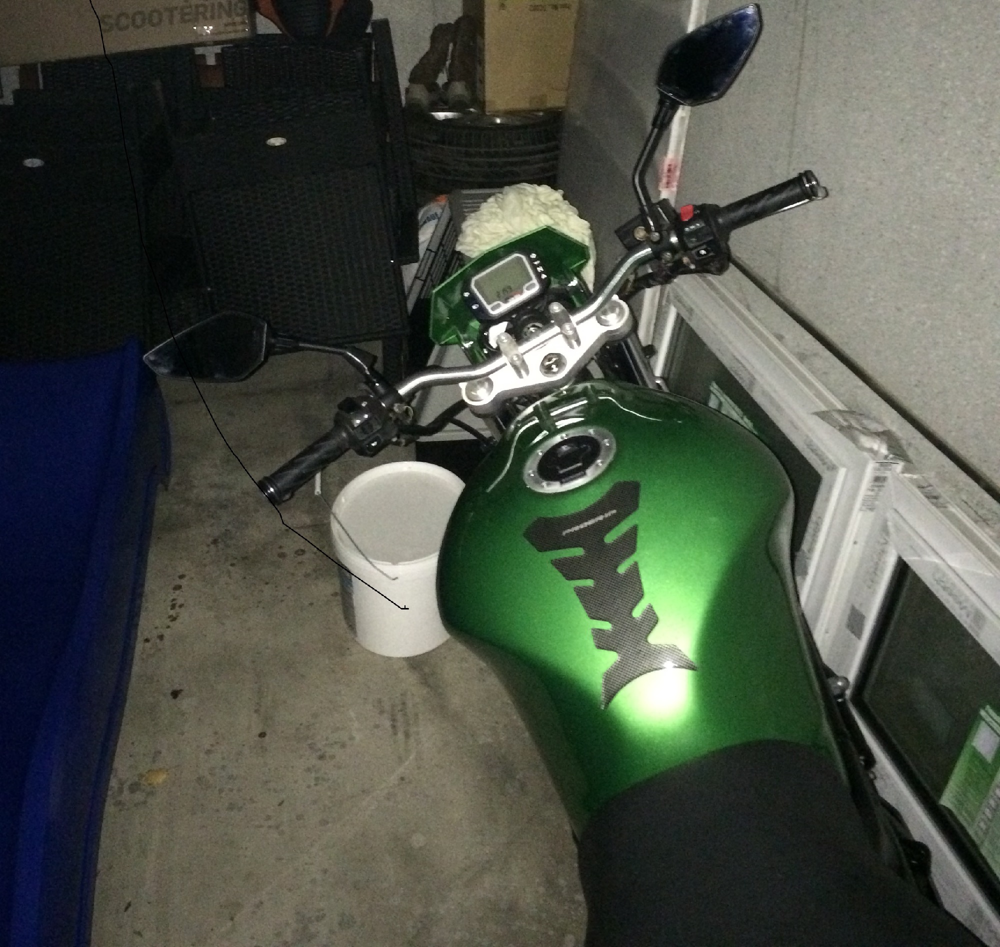 Ich würde Maske und Kotflügel grün machen lassen. Beim Bugi wäre ich tatsächlich unschlüssig. Auf jeden Fall aber die Schwinge, Fußrastenplatten, Gabel schwarz. Felgen evtl auch schwarz, oder schwarz grün? Who knows.