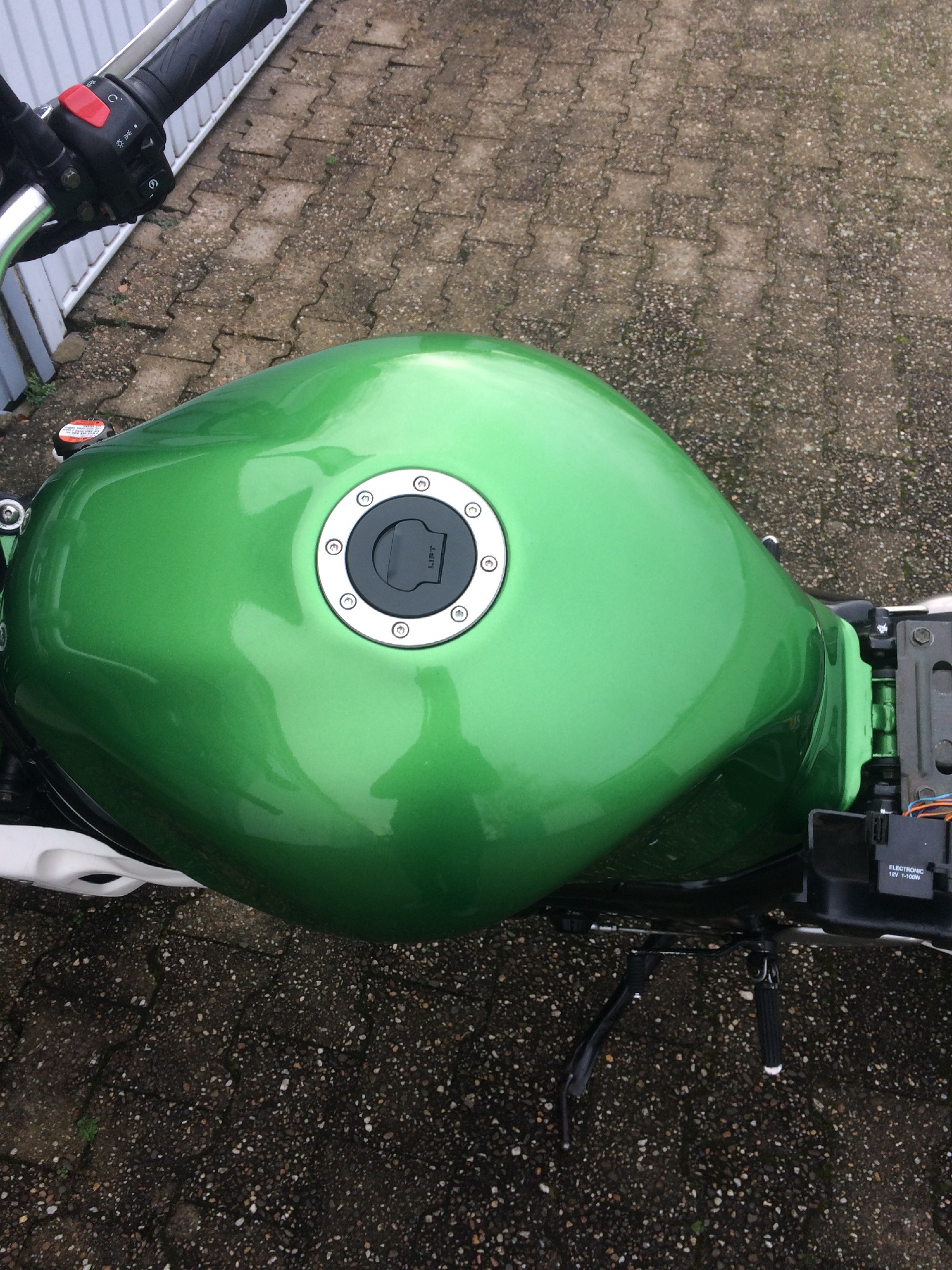 Nach entfernen von den Tankaufklebern, stellte ich dann fest, dass der Tankdeckel total zermackt war; also neu