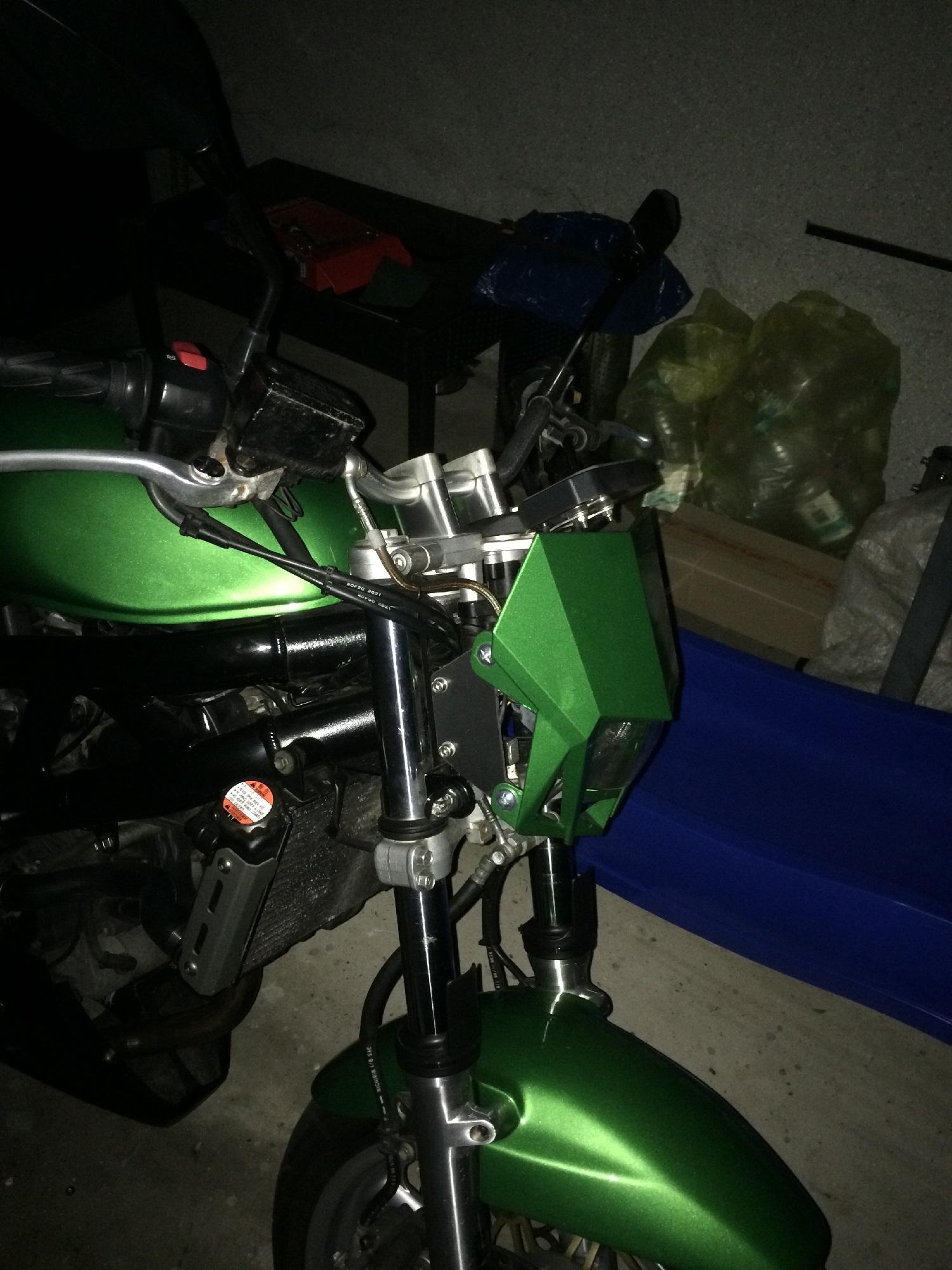 Die Lampenmaske hat mir auch nie besonders gefallen. Durch Internetrecherche bin ich dann auf die KLX Maske gestoßen.......aber zu sehr teuren Preisen. Ebay sei dank, habe ich den Scheinwerfer original neu für 40 € erstanden. Die Verkleidung gab es für weitere 40 € bei KFM