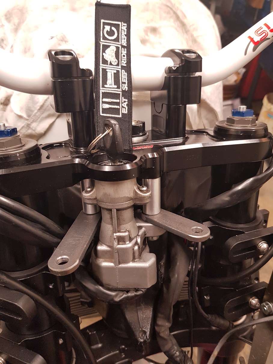 Gabel(untere Gabelbrücke wurde schwarz gepulvert)/ABM Gabelbrücke mit separaten Rizern für die N/weißen konifizierten LSL Lenker/ Bremsanlage der R1.... zusätzlich kam während des Umbaus dieses Jahr noch die Coolride Griffheizung , LED Scheinwerfer und `n Ganganzeige.