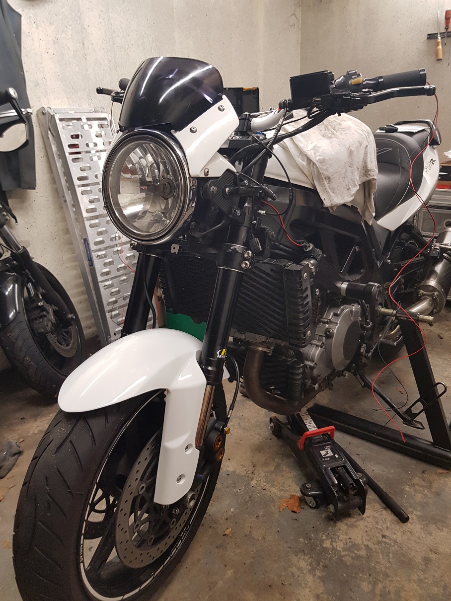 Das ist sehr schick geworden. Die schwarze Gabel und der weiße Lenker... Das kommt echt gut! Was hast du für einen LED Scheinwerfer verwendet? Die Lenkungsdämpfer Problematik hatte ich auch, ist im Forum sehr gut beschrieben wie das zu lösen ist. Ich baue gerade eine "S" zur "N" um und arbeite auch gerade an einer Tacho - Halterung.