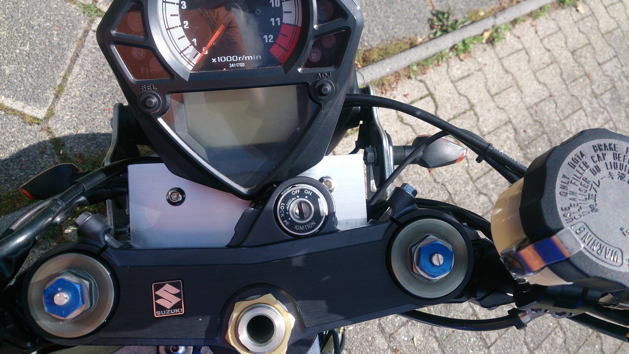 Das Tachoblech ist einfach zwischen Gabelbrücke und Zündschloss gesandwiched und der Tacho hat noch seine originale Konstruktion dran um den richtigen Winkel zu erzielen. Netter Nebeneffekt ist, dass das Zündschluss fast plan mit der Oberseite der Gabelbrücke sitzt :D
