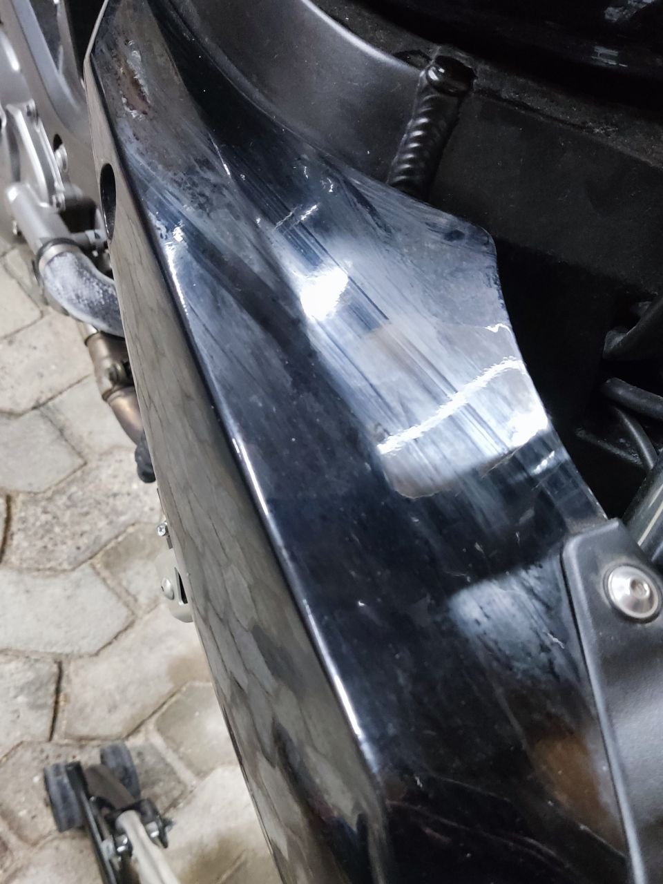 Vom erwähnten Rutscher auf der rechten Seite sind nur noch ganz leichte Spuren am Motordeckel und der Kühlerblende sowie am Standrohr zu sehen. Wenn man es nicht weiß, fallen die Kratzer am Motordeckel und der Kühlerblende gar nicht auf.