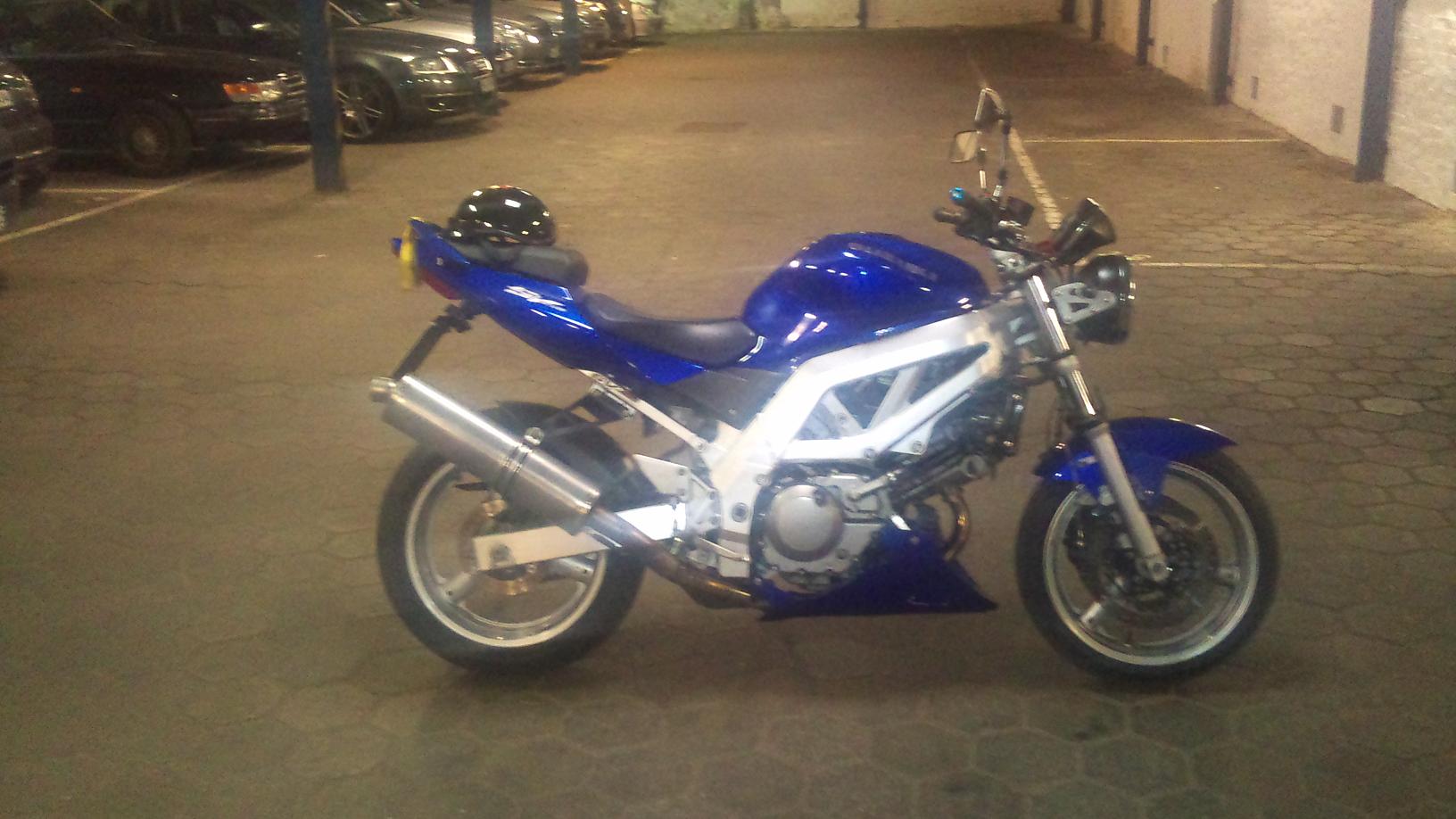 Jau! Der Leo is da!!! In der Zwischenzeit is einiges passiert! hab´ne Bodenprobe genommen, seitdem sind die blauen Lenkergewichte den Orginalen gewichen! Der tank hat ´ne Beule! Der Schalthebel is mal wieder verbogen! Weil die "schöne" Orginaltüte verschrabbelt war und sich angehört hat wie ein VW Käfer (kein Scheiß´) hab ich nun nen Leo dran! Und die Kiste läuft und läuft und läuft...