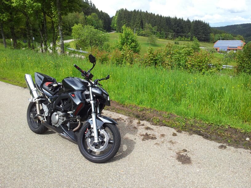 Ich bin zunächst hoch auf die Straße, die Gruppe hat irgendwann gemerkt, dass manche fehlen und haben umgedreht. Ich habe meine Jacke und Helm ausgezogen, und dann die Stiefel und mal die Hosen hoch um zu gucken ob da was ist......war nur Druckstelle auf dem Scheinbein.....aufgestanden Schuhe wieder angezogen und bin runter zu meiner Kleinen. Erstmal kleinteile aufgesammelt und nach oben gebracht. Dann hielt ein Auto an und fragte ob wir H ilfe brauchen, ob ich vll ins Krankenhaus muss. Die Jungs haben irgendwo ein Seil besorgt......an unterer Gabelbrücke angebunden. Mit gemeinsamen Kräften haben wir das Ding nach oben geschafft. Und dann gings halt los.........8 Biker rennen um meine Suzi herum und machen irgendwas. Ich habe überhaupt nix mehr geblickt, Schock, Adrenalin.......hab mich hingesetzt, hab einer Wasserflasche bekommen und hab abwesend die Situation durchdacht.