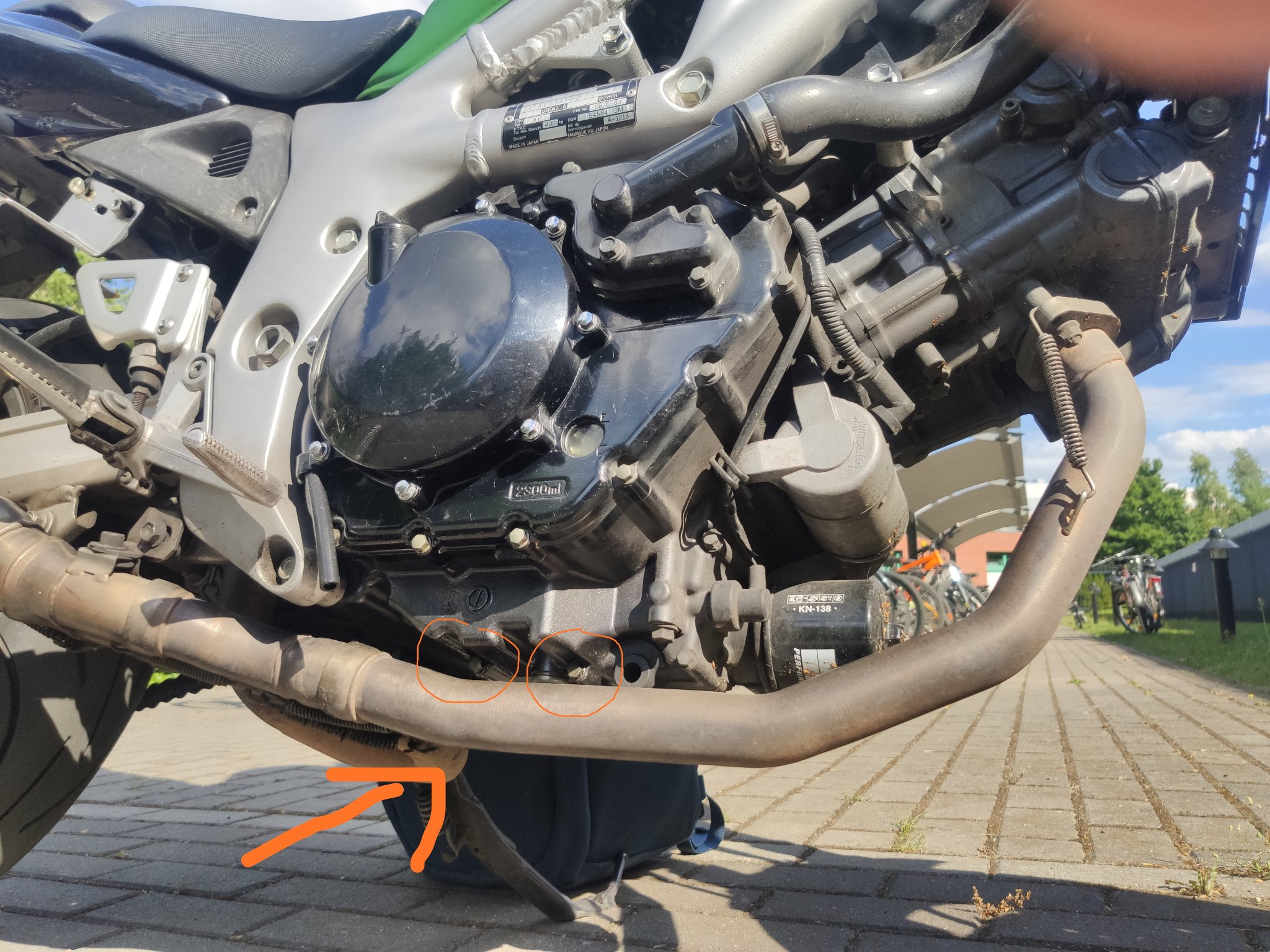 Mein Bike verliert Öl - es sind jeweils nur wenige Tropfen, die an der Unterseite austreten, trotzdem doof, da ich jedesmal auf dem Gehweg Flecken hinterlasse. Auf dem Bild seht ihr rot eingekreist die zwei Schrauben, an denen das Öl auszutreten scheint. Die Ölablassschraube ist dicht, am Filter ist auch alles super, die Dichtung vom Kupplungsdeckel scheint in Ordnung.
