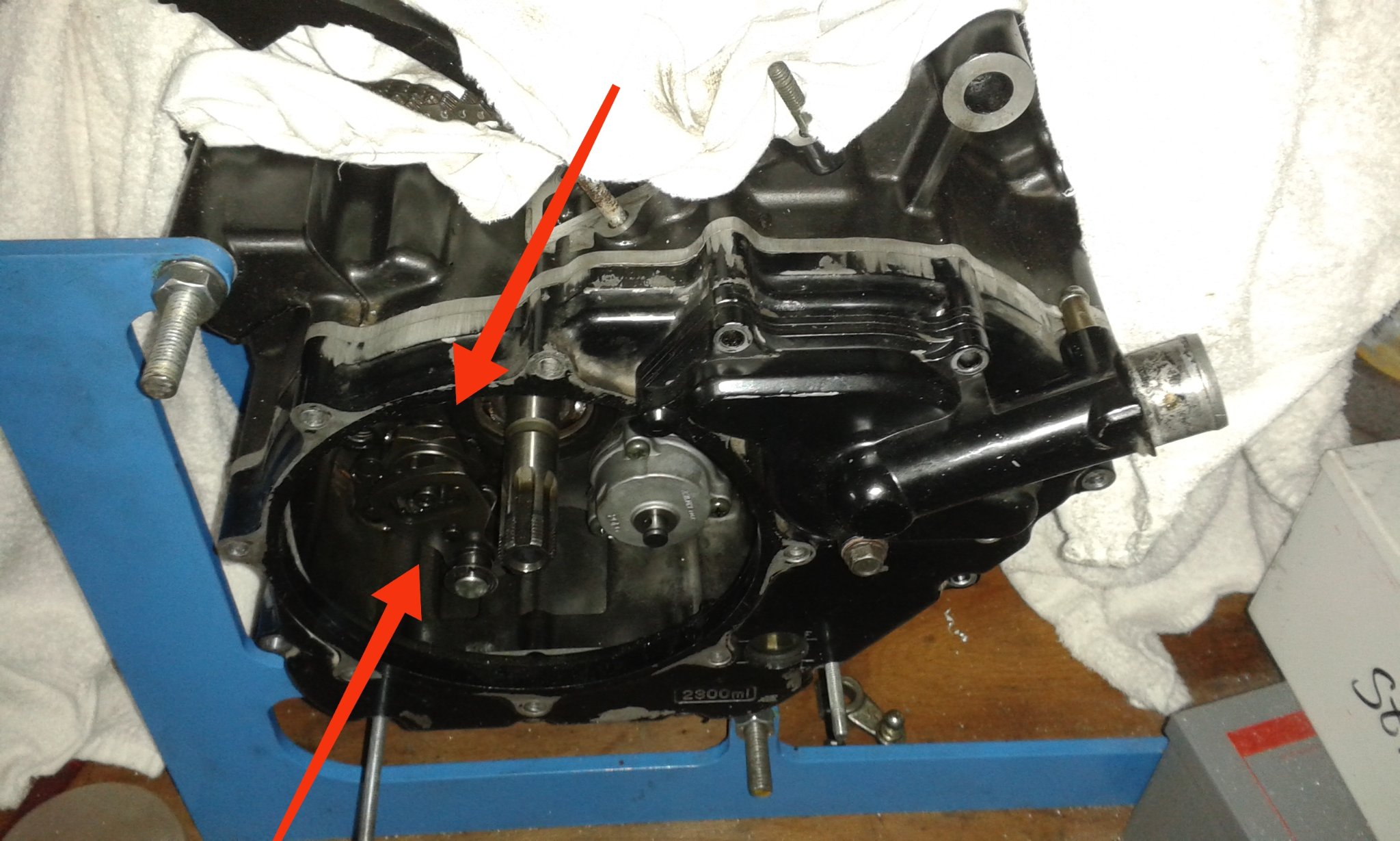 Die Teile sitzen hinter der Kupplung, also Kühlwasser und Öl ablassen. Bei der Kante den kompletten rechten Motordeckel abnehmen. Kupplung demontieren. Dahinter das Bild (hier Knubbel, ist aber das gleiche):