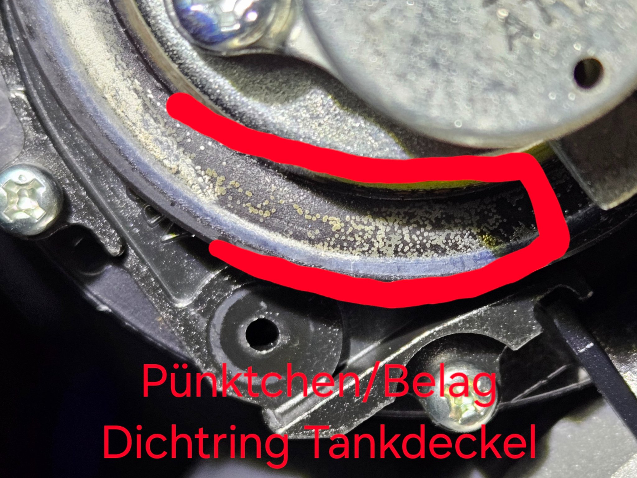 Und am Dichtring vom Tankdeckel ist ein komischer Belag bzw. Pünktchen, die beim Kratzen mit dem Fingernagel zu einer staubigen Schicht werden.