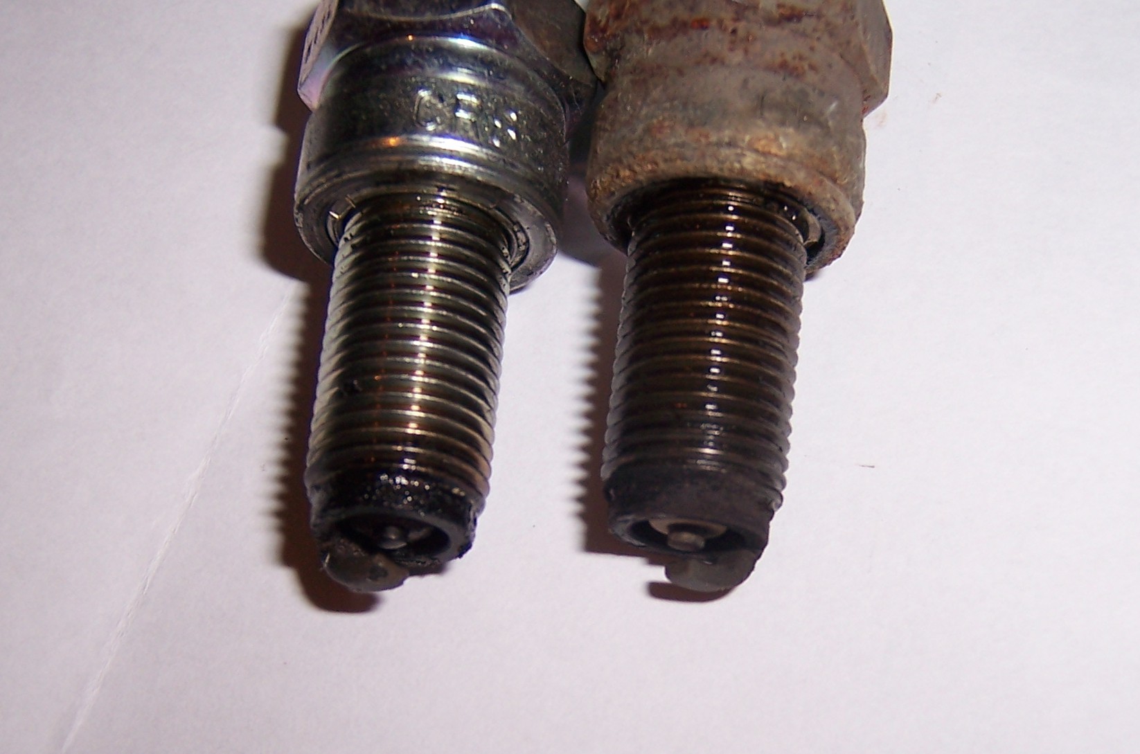 Okay, ich werde schauen, wie sie sich verhält. Hab aber trotzdem ein leicht ungutes Gefühl in der Magengegend. Nächstes Jahr werde ich mehr in Erfahrung bringen können. Habe zum Spaß trotzdem mal ein Foto von den Zündkerzen gemacht. Links ist die aus dem hinteren Zylinder die mir Bauchschmerzen bereitet. Rechts die sieht noch ganz "okay" aus. Hab zwar schon bessere gesehen, aber die stecken da wrsl schon seit 30tkm drin :?