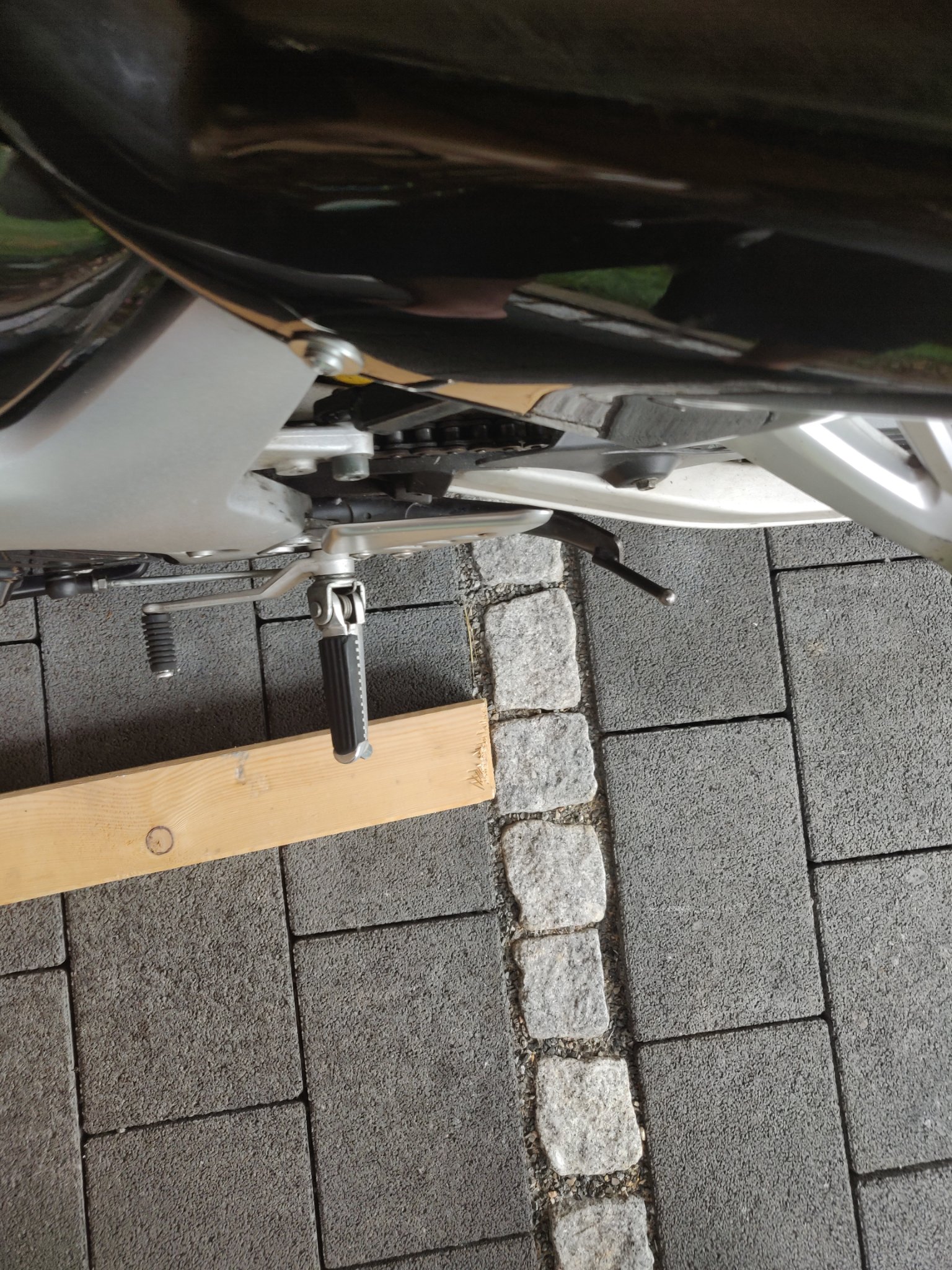 Was ich im ersten Foto so komisch finde ist, dass der Seitenständer quasi Rechtwinklig zur Schwinge steht...