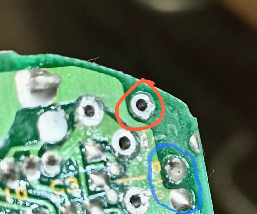 das ist vermutlich keine tote Öse, denn dann würde der Überspannungsschutz aus Diode und Widerstand ja nicht funktionieren. Macht er aber, sonst wäre der Widerstand nicht angekokelt. Das ist vermutlich doch eine Multilayerplatine. Man könnte von der scheinbar toten Öse mit einem Multimeter im Widerstandsmessbereich auf die umliegenden Anschlüsse messen. Wenn es eine tote Öse ist sollte der Widerstand immer unendlich sein, bei Multilayer je nach verwendetem Anschluss unterschiedliche Widerstandswerte.