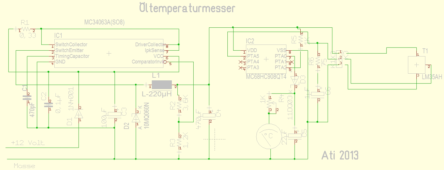 Der kleine Controller hängt mit zwei Anschlüssen an der Betriebsspannung, mit einem Eingang am Sensor und am Ausgang direkt das Messwerk. Eingangsseitig ist die Messspannung mit einem Dämpfungsglied gegen Störeinflüsse versehen. Am Ausgang befindet sich ein Trimmer, mit dem das Anzeigeinstrument letztlich "feingetrimmt" werden kann. Man kann den Trimmer auch weglassen, muss dann aber präzise programmieren. Der Kondensator integriert die Ausgangsspannung des Kontrollers und bestimmt die Dämpfung des Zeigers. Er muss von seiner Größe her auf das jeweilige Instrument angepasst werden.