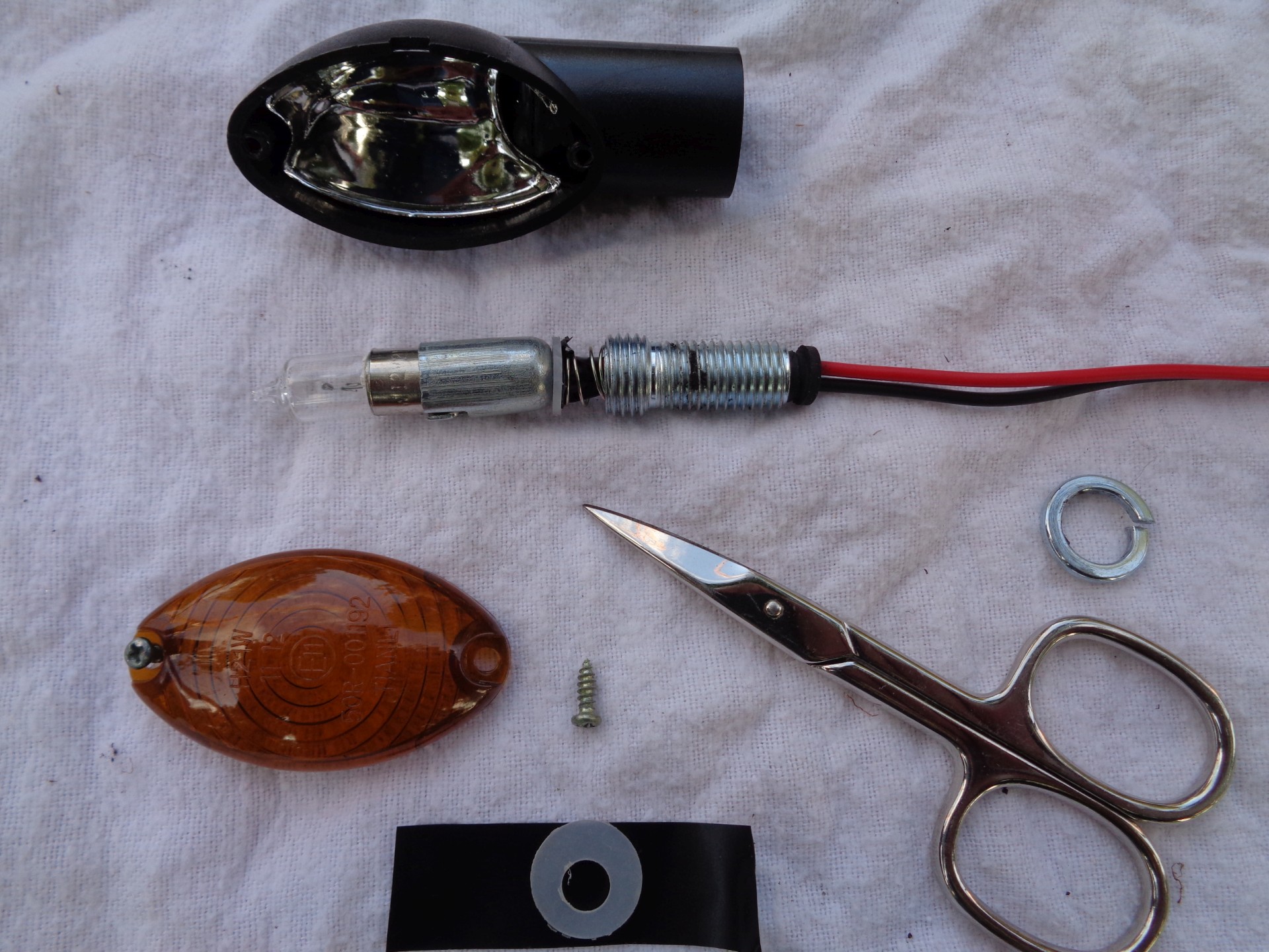 Eine zusätzliche Isolierung musst also her: nach dem vollständigen Zerlegen hab ich eine U-Scheibe aus Plastik, auf ø gebracht mit der Nagelschere und mit Isolierband fixiert, zwischen Lampenfassung und Feder montiert, siehe Bild 2. Angebaut, getestet und gefahren, funktioniert einwandfrei ;) bier