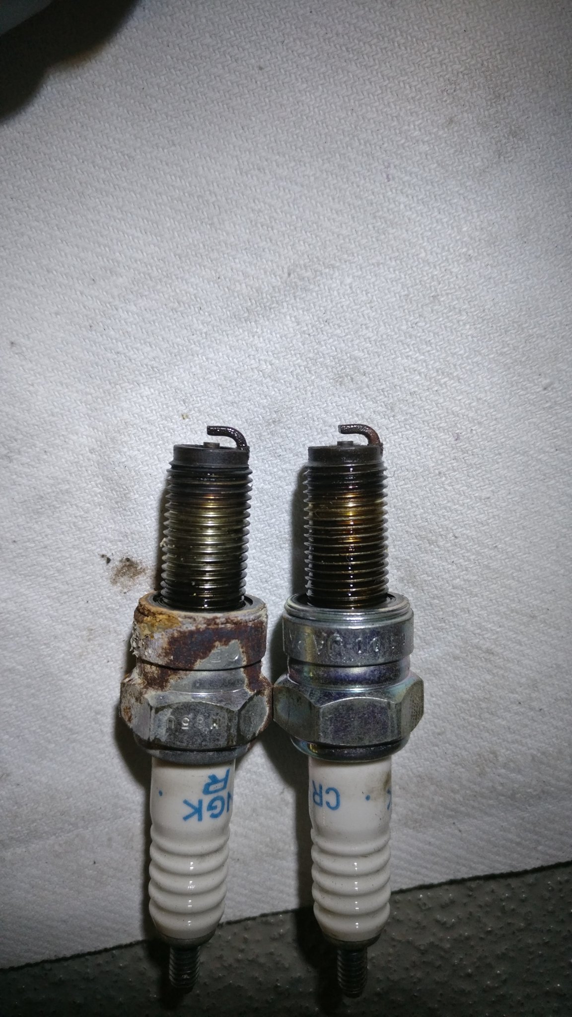 die Kerze sieht so rostig aus, weil die Ablaufbohrung vom vorderen Zylinder zu ist. Die muss gereinigt werden, aber nur wenn die Kerze drin ist, damit der Dreck nicht in den Brennraum fällt. Die hintere Kerze hat einen dunklen Fleck, schau Dir das mal genauer an ob das nur etwas Russ ist oder ob das Porzellan einen feinen Riss hat. Schaue auch in den hinteren Kerzenstecker ob Dir was auffällt. Wenn der Funke vom Kerzenstecker auf die dunkle Stelle der Kerze überschlägt läuft der hintere Zylinder nicht richtig.